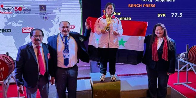 Ulán Bator, 8 sep (SANA) La atleta de la selección nacional siria para fuerza física, Shaima Sukkar, ganó la medalla de oro en el Campeonato Asiático en esta disciplina que se celebra actualmente en la capital de Mongolia, Ulán Bator, con la participación de nueve equipos.