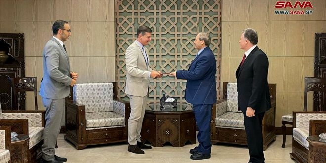 Damasco, 15 sep (SANA) El canciller Faisal al-Mekdad, recibe las credenciales de José Gregorio Biomorgi Muzattiz como Embajador Extraordinario y Plenipotenciario de la República Bolivariana de Venezuela en Siria.