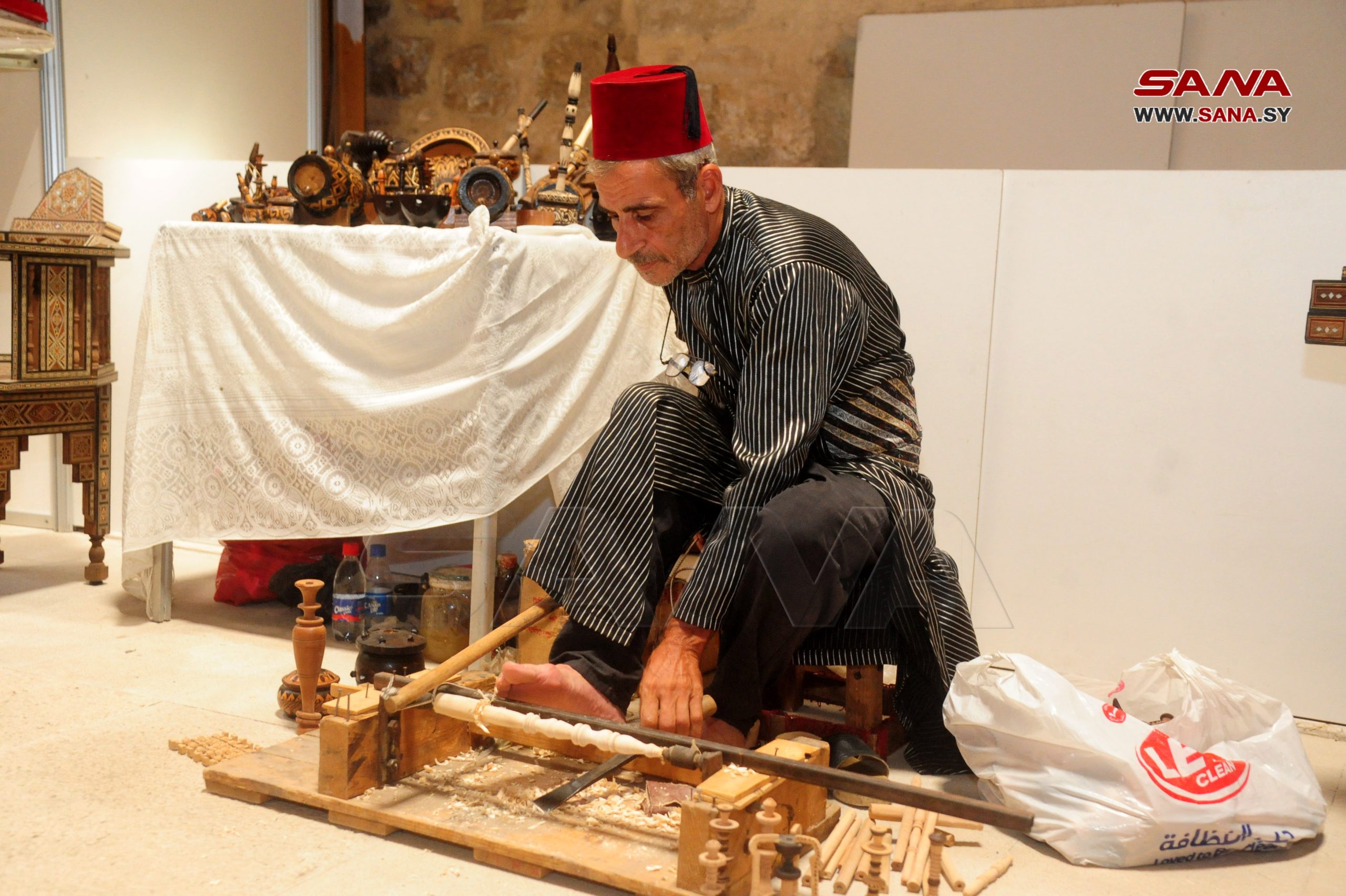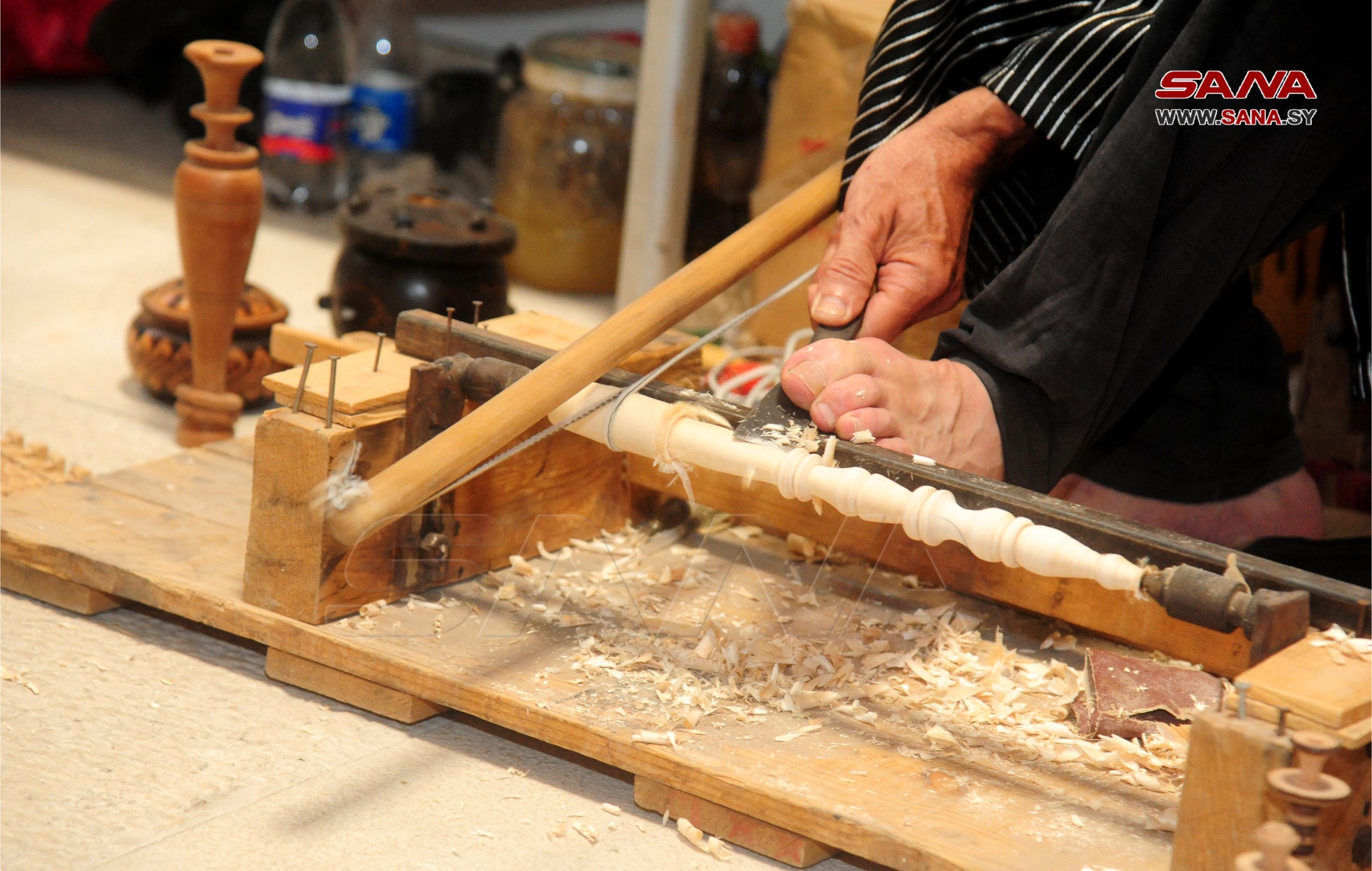 Damasco, 16 sep (SANA) Con su traje tradicional damasceno, el artesano Mamoun Al-Hallaq, pasa la mayor parte de su tiempo haciendo mini esculturas tradicionales elaboradas con gran precisión en el torno de madera casero y manual que heredó de su padre para hacer distintos tipos de muebles, antigüedades, cajas decoradas y arabescos.