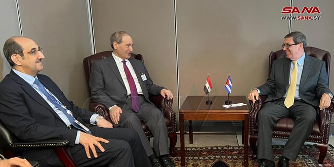 Nueva York, 21 sep (SANA) El ministro de Asuntos Exteriores, Faisal al-Mekdad, se reunió hoy con su homólogo cubano Bruno Rodríguez Parilla, al margen del 77º período de sesiones de la Asamblea General de las Naciones Unidas, en Nueva York.