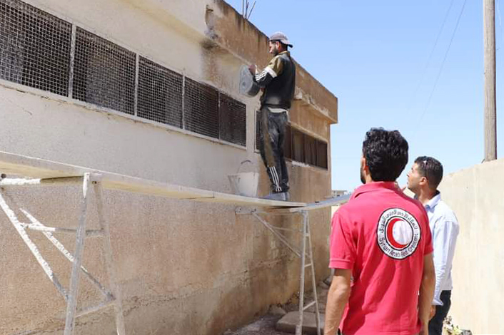 El jefe de la rama de la Media Luna Roja, Ahmed Al-Masalmah, comunicó a SANA que las obras incluyen instalaciones eléctricas y de servicios, patios, puertas, ventanas, impermeabilización de los techos.