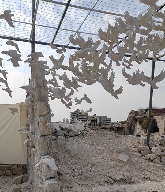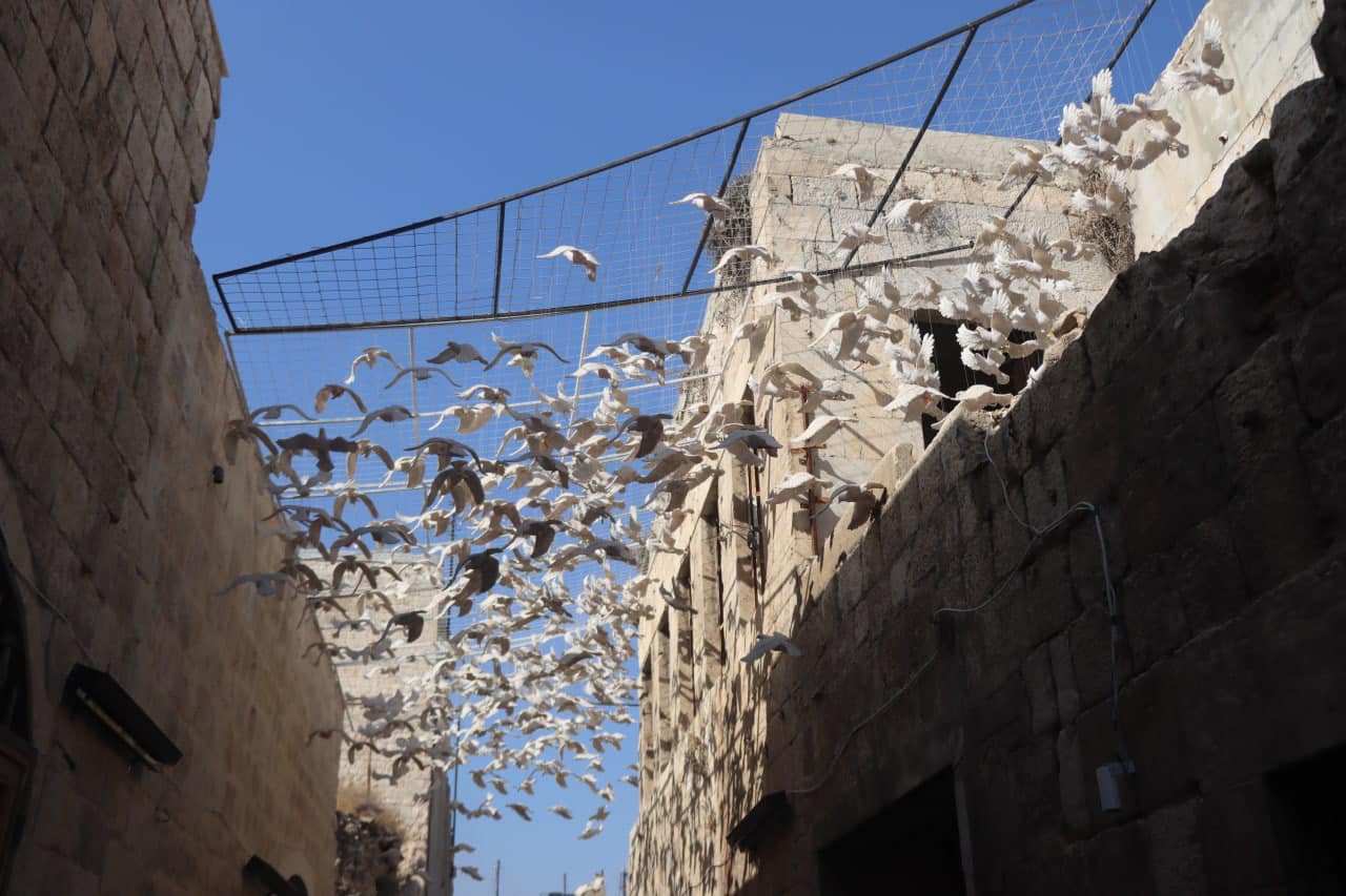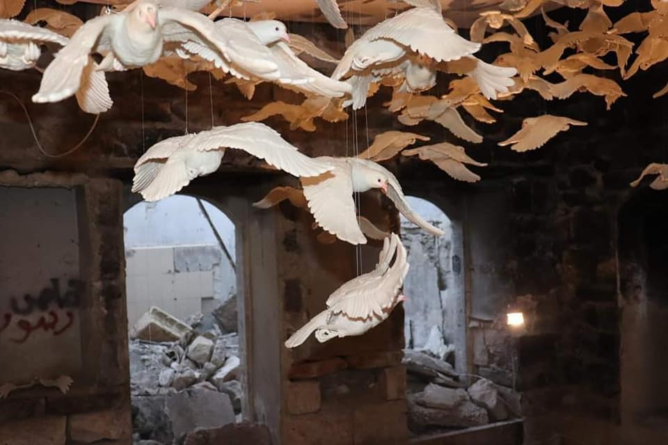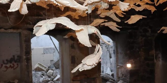 Damasco, 3 nov (SANA) Un grupo de artistas sirios montaron una exposición bajo el lema “Érase una Vez, Alepo” en la que emplearon palomas blancas como símbolos para devolver la vida a lugares devastados por la guerra.