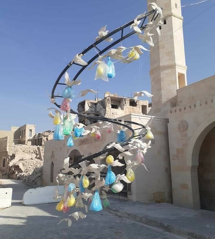 Los creadores de diferentes generaciones y gobernaciones sirias, escogieron la plaza al-Hattab en la ciudad antigua de Alepo que fue devastada por la guerra, y ahí montaron 29 de sus trabajos artísticos dando un toque de vida y colorido al lugar.