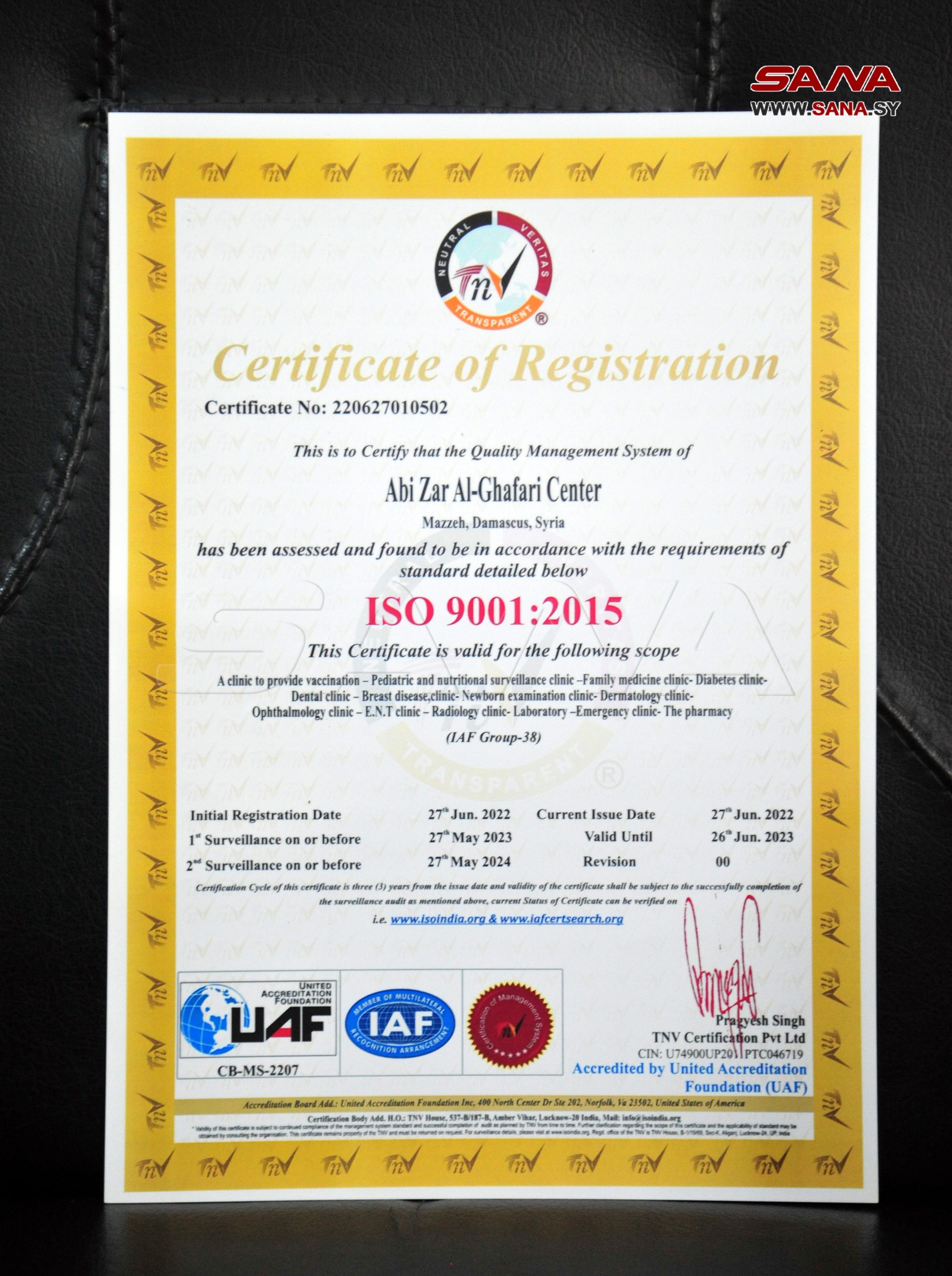 Damasco, 04 nov (SANA) El Centro de Salud Abuzar Al-Ghafari en Damasco recibió el certificado ISO 9001-2015 por desarrollar el trabajo médico y la prestación de servicios de la mejor calidad.