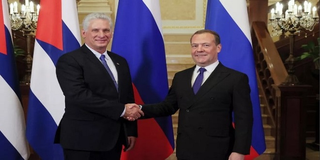 Moscú, 21 nov (SANA) El vicepresidente del Consejo de Seguridad de Rusia, Dmitri Medvédev, dijo hoy al recibir aquí al presidente de Cuba, Miguel Díaz-Canel, que ambos países consolidan lazos de hermandad frente a las sanciones económicas de Occidente.