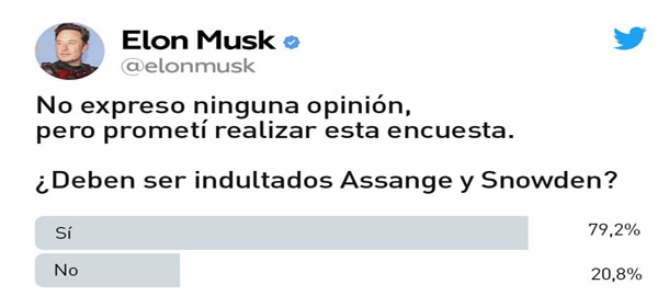 Washington, 4 dic (SANA) El director ejecutivo de Twitter, Elon Musk, lanzó una nueva encuesta en la red en la que preguntó a sus seguidores si hay que indultar al fundador de WikiLeaks, Julian Assange, y al exempleado de la Agencia de Seguridad Nacional (NSA) y de la CIA, Edward Snowden, informó la cadena rusa RT.