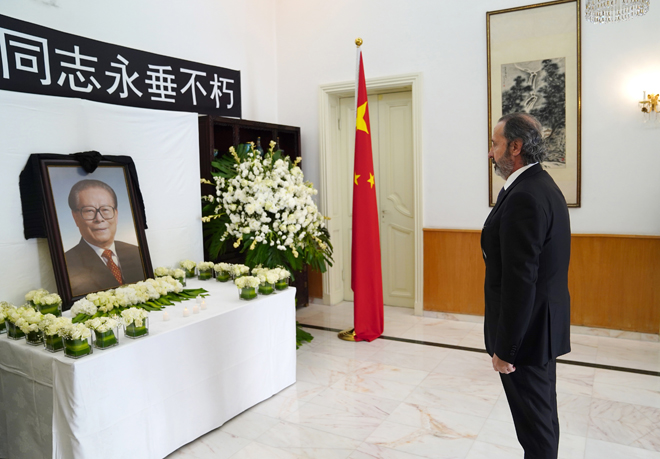 El ministro Azzam escribió unas palabras en el libro de condolencias, en las que transmitió las condolencias del presidente al-Assad al pueblo y liderazgo chino por el fallecimiento del presidente Zemin.
