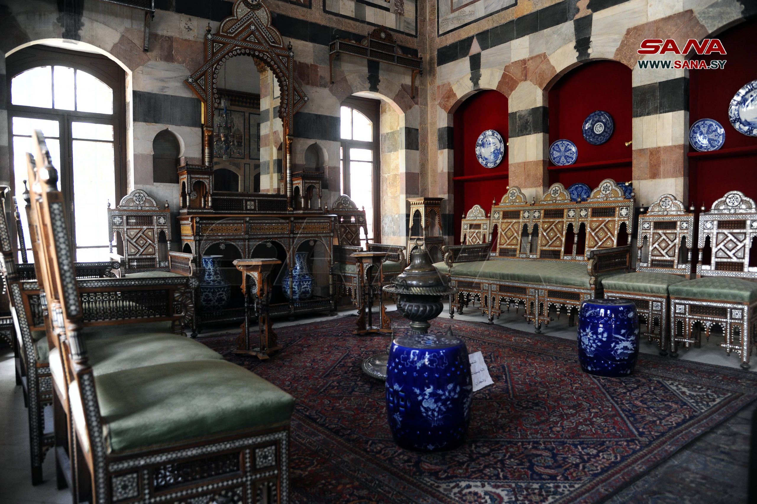 En 1954, el Palacio fue restaurado y convertido en el Museo de Costumbres y Artesanías Populares, y alberga en sus salas muestras del patrimonio de Damasco de escritura, enseñanza, música, y costumbres que matizan la vida diaria de los sirios.