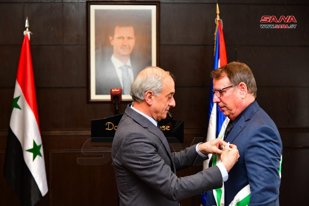 “El presidente Al-Assad firmó un decreto en virtud del cual concede la Orden al Mérito sirio de Excelentísimo Grado al embajador Parga, en reconocimiento por sus grandes esfuerzos para fortalecer los lazos entre los dos países amigos”, dijo el ministro asistente de Asuntos Exteriores y Emigrantes, Ayman Sousan, quien condecoró al embajador en un acto de despedida realizado por la Cancillería en el hotel Dama Rose de Damasco.