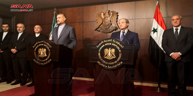 Damasco, 14 ene (SANA) El ministro de Asuntos Exteriores y Expatriados, Faisal Al-Mekdad, sostuvo una rueda de prensa conjunta con su homólogo iraní, Hussein Amir Abdullahian, tras finalizarse sus conversaciones sostenidas en la sede de la Cancillería siria.