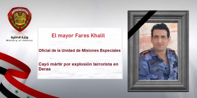 El mayor Fares Khalil de la Unidad de Misiones Especiales falleció hoy, mientras los dos policías Muhammad Diab y Fadi Hammadi resultaron heridos por la explosión, informó el ente.
