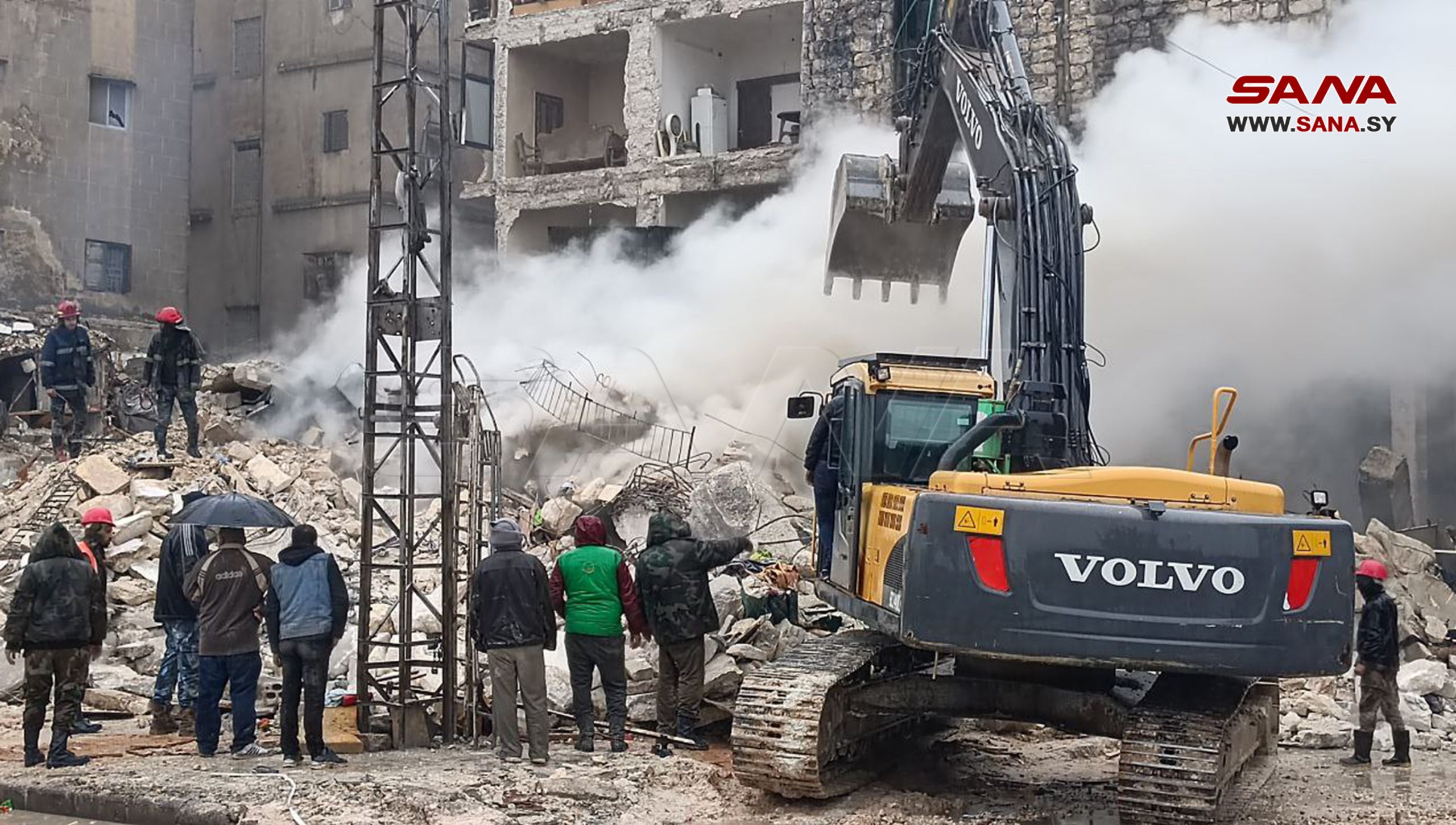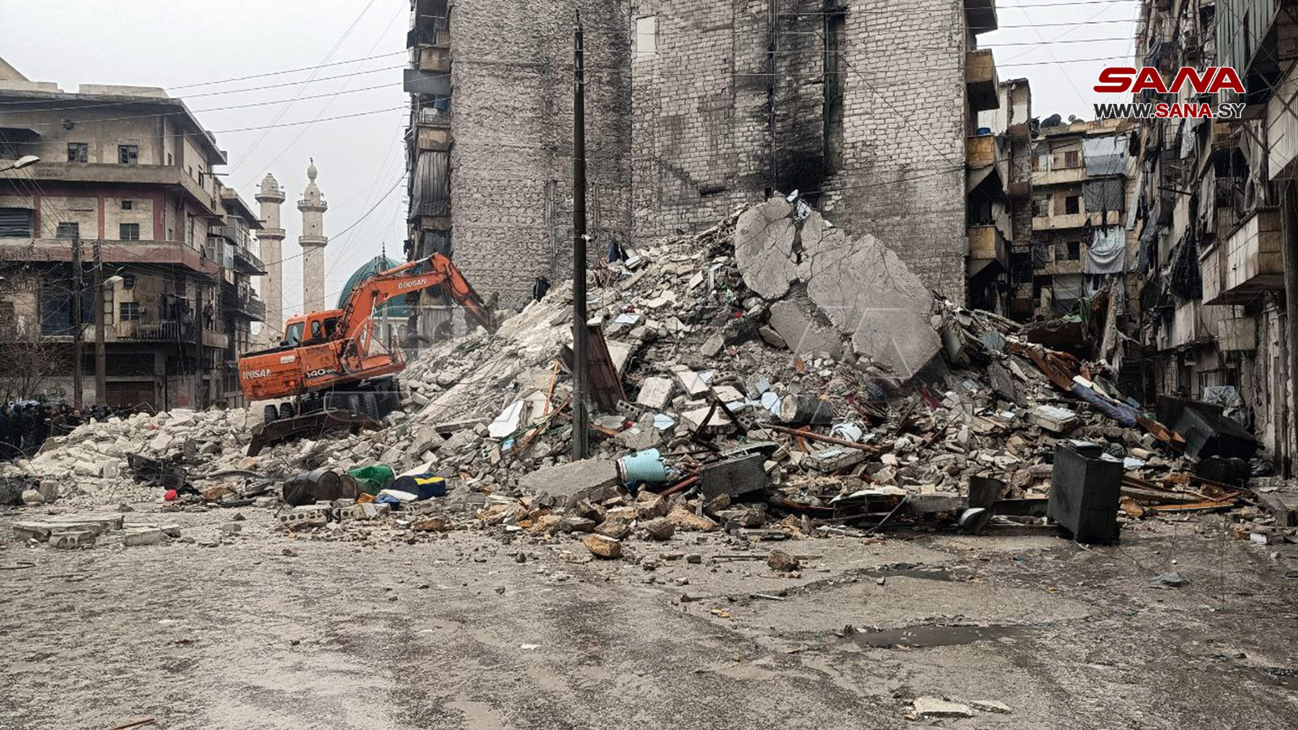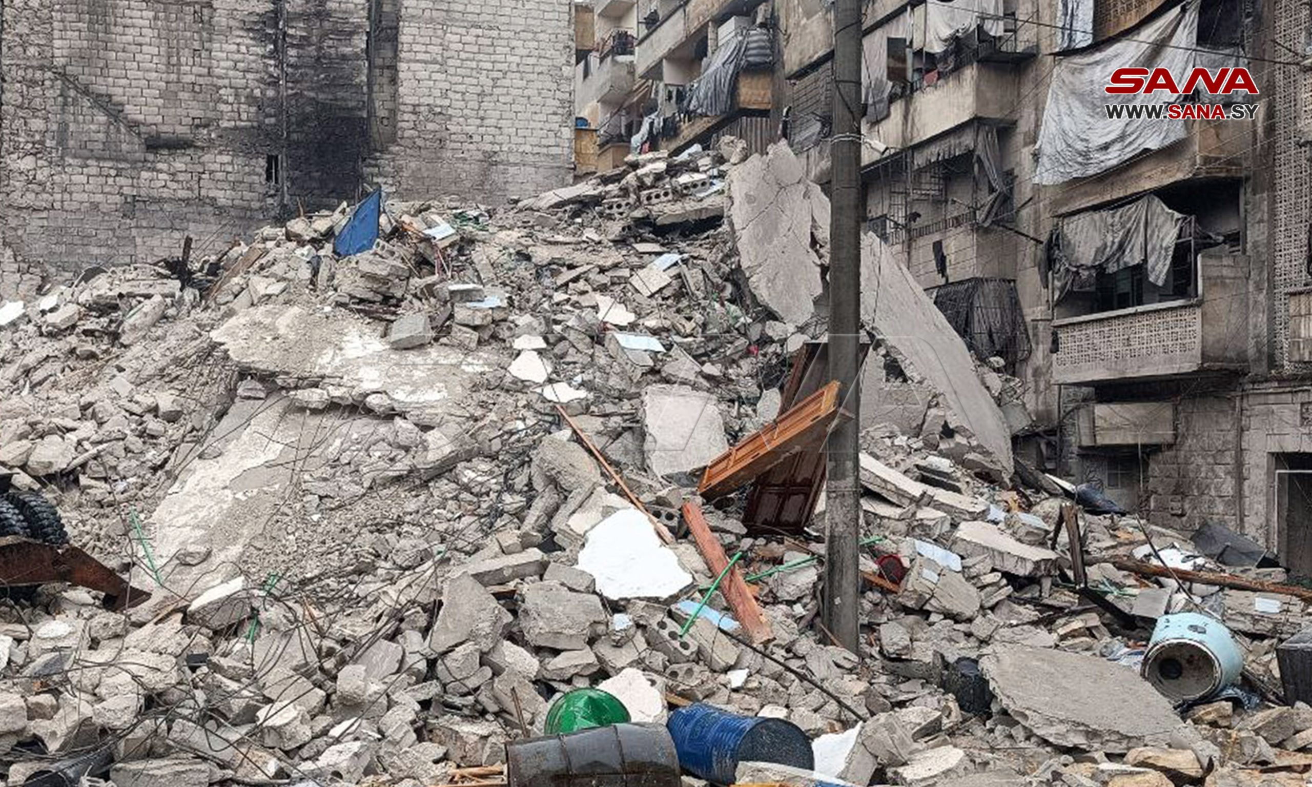 Alepo, 6 feb (SANA) Tres edificios de cuatro pisos fueron derrumbados en el barrio de Al-Kallaseh, cerca de la Universidad Zaid bin Haritha en la ciudad de Alepo, a causa del terremoto de magnitud 7,7 que ocurrió a las 04:17 al norte de Alejandreta mientras una réplica de 6,4 grados sacudió la región de Taurus en la frontera sirio-turca.