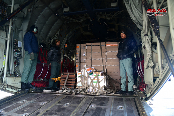 Damasco, 08 feb (SANA) Cuatro aviones de Emiratos Árabes Unidos, Jordania, La India y Pakistán llegaron hoy al Aeropuerto Internacional de Damasco con ayuda humanitaria, alimentaria y farmacéutica para los afectados por el terremoto que acaeció en Siria el lunes pasado.
