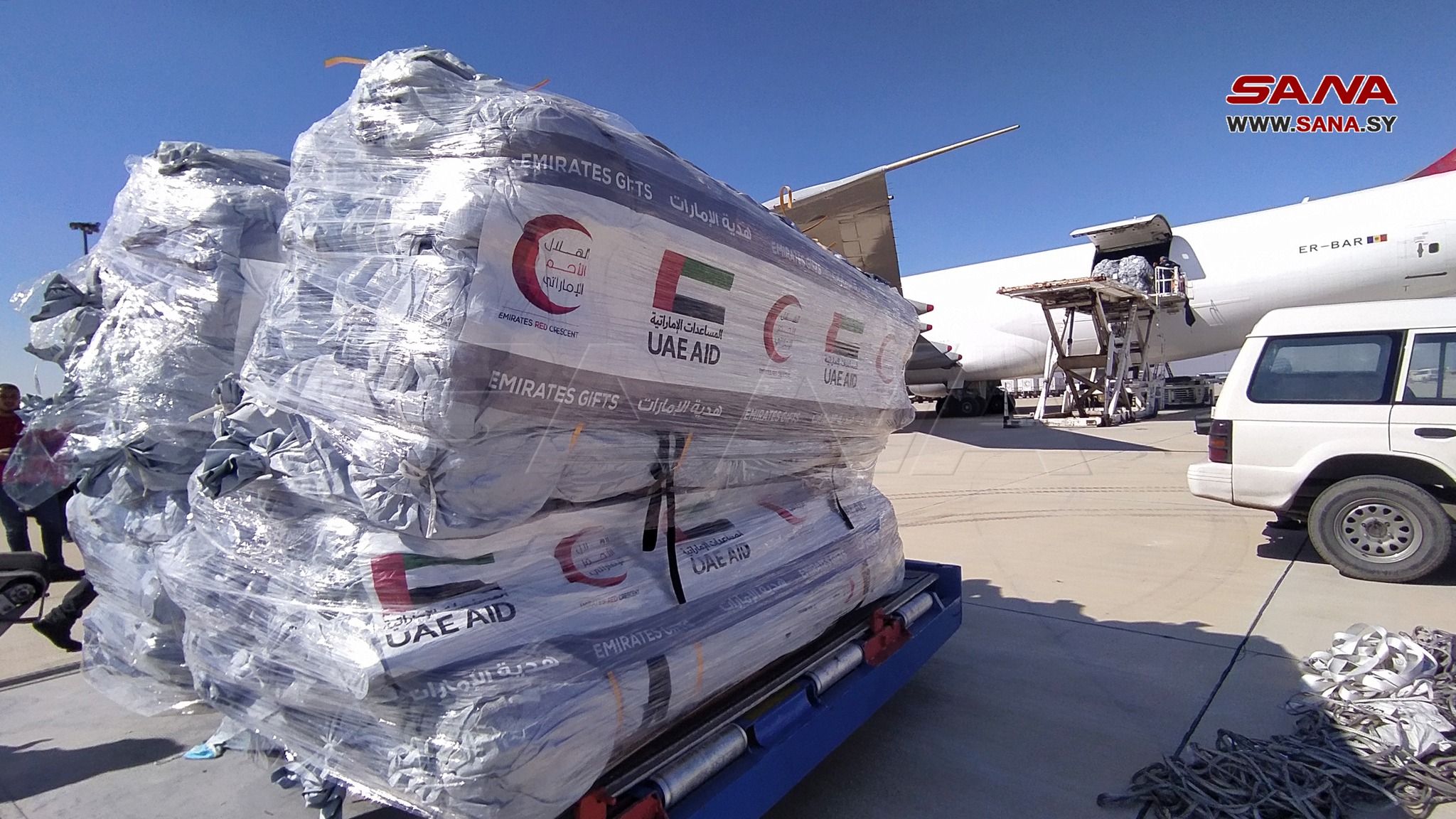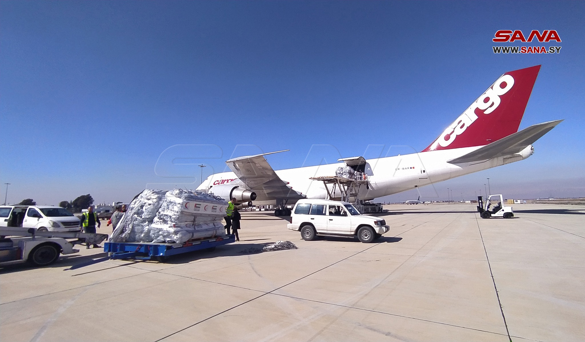 Damasco, 9 feb (SANA) Cuatro aviones (dos de Emiratos Árabes Unidos, uno de Irán y otro de Omán) arribaron hoy al Aeropuerto Internacional de Damasco, cargados con ayuda humanitaria destinada para los afectados por el terremoto.