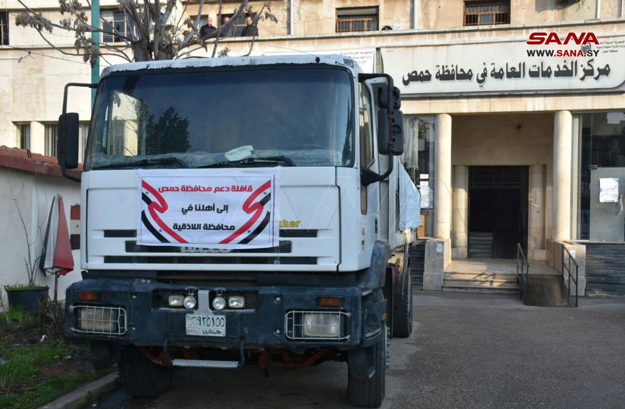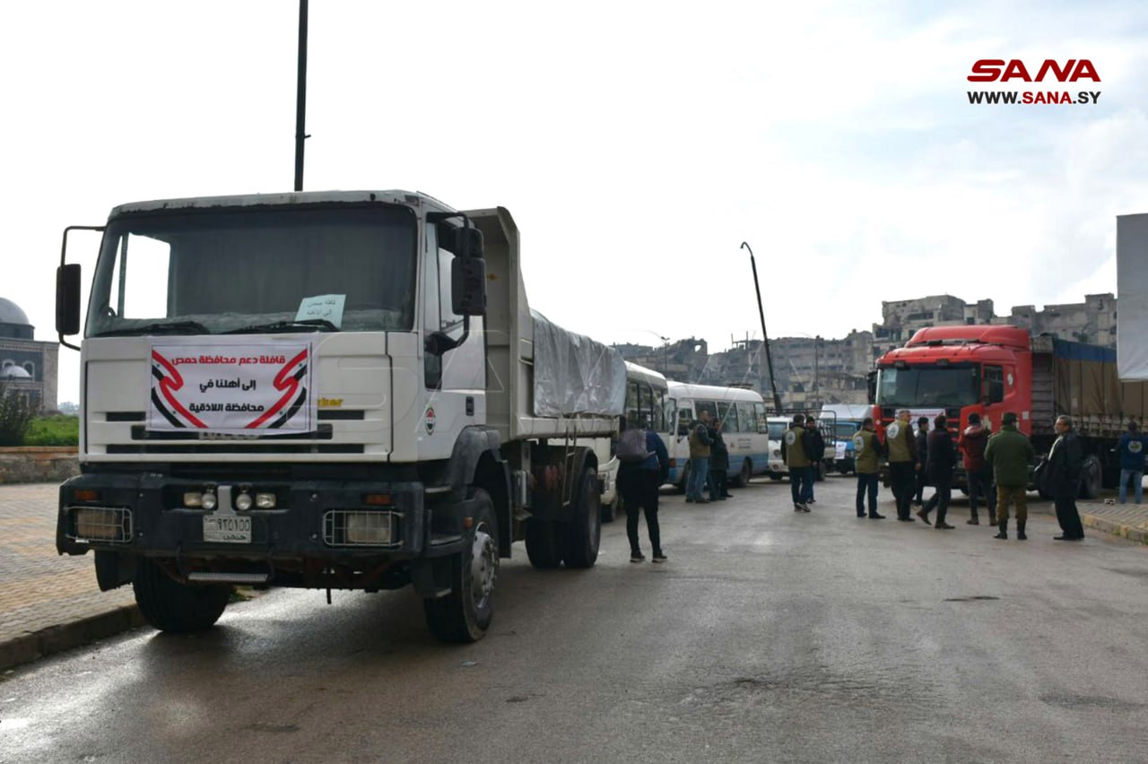 Provincias, 12 feb (SANA) Un convoy de ayuda gestionada por asociaciones civiles y entidades eststales de la provincia de Homs se dirigió a las provincias de Alepo y Latakia para ayudar a los afectados por el terremoto.