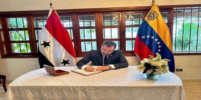 Caracas, 14 feb (SANA) El Ministro del Poder Popular para Relaciones Exteriores de la República Bolivariana de Venezuela, Yván Gil, junto con la viceministra para Asia, Medio Oriente y Oceanía, Tatiana Pugh, y varios altos funcionarios venezolanos acudieron hoy a la Embajada de Siria en Caracas para expresar sus profundas condolencias al pueblo y gobierno de Siria por las víctimas del terremoto.