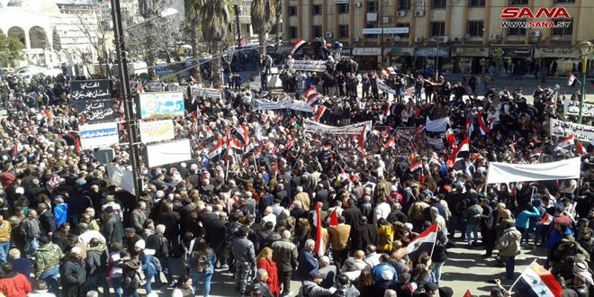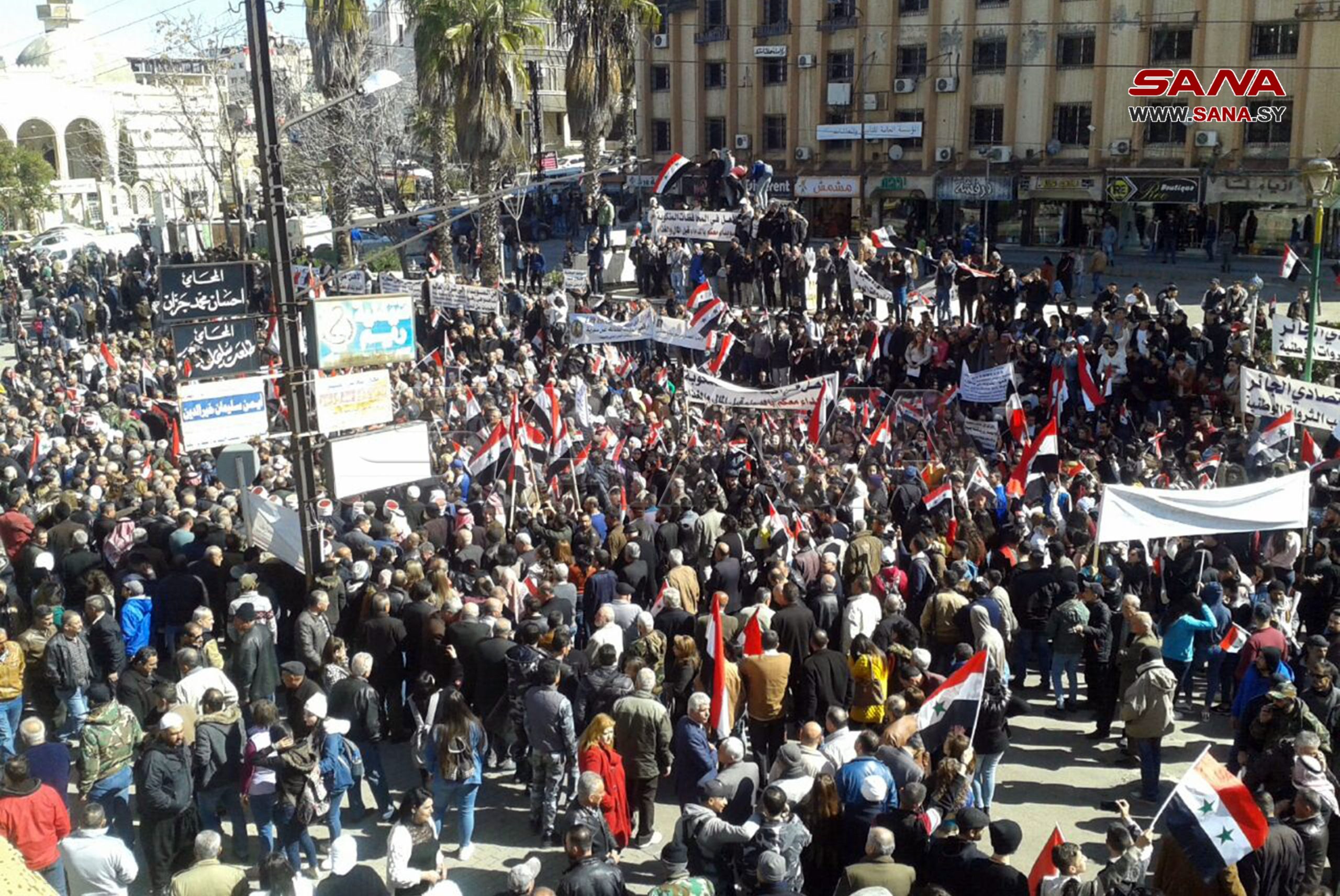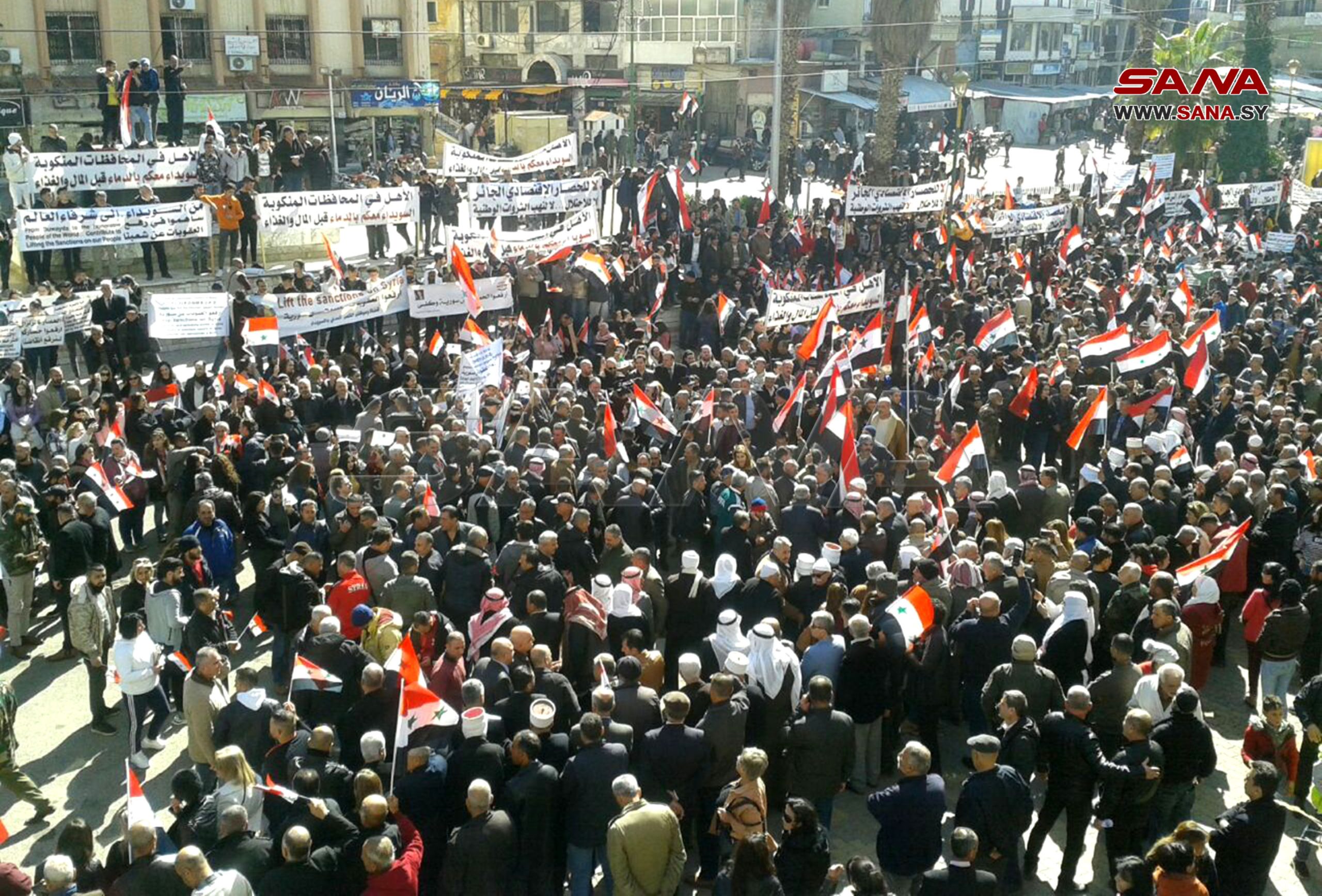 Sweida, 20 feb (SANA) Frente a la sede del ayuntamiento de la ciudad de Sweida, capital de la provincia del mismo nombre, se congregaron miles para condenar las continuas agresiones israelíes contra Siria y las medidas coercitivas unilaterales impuestas al pueblo sirio.