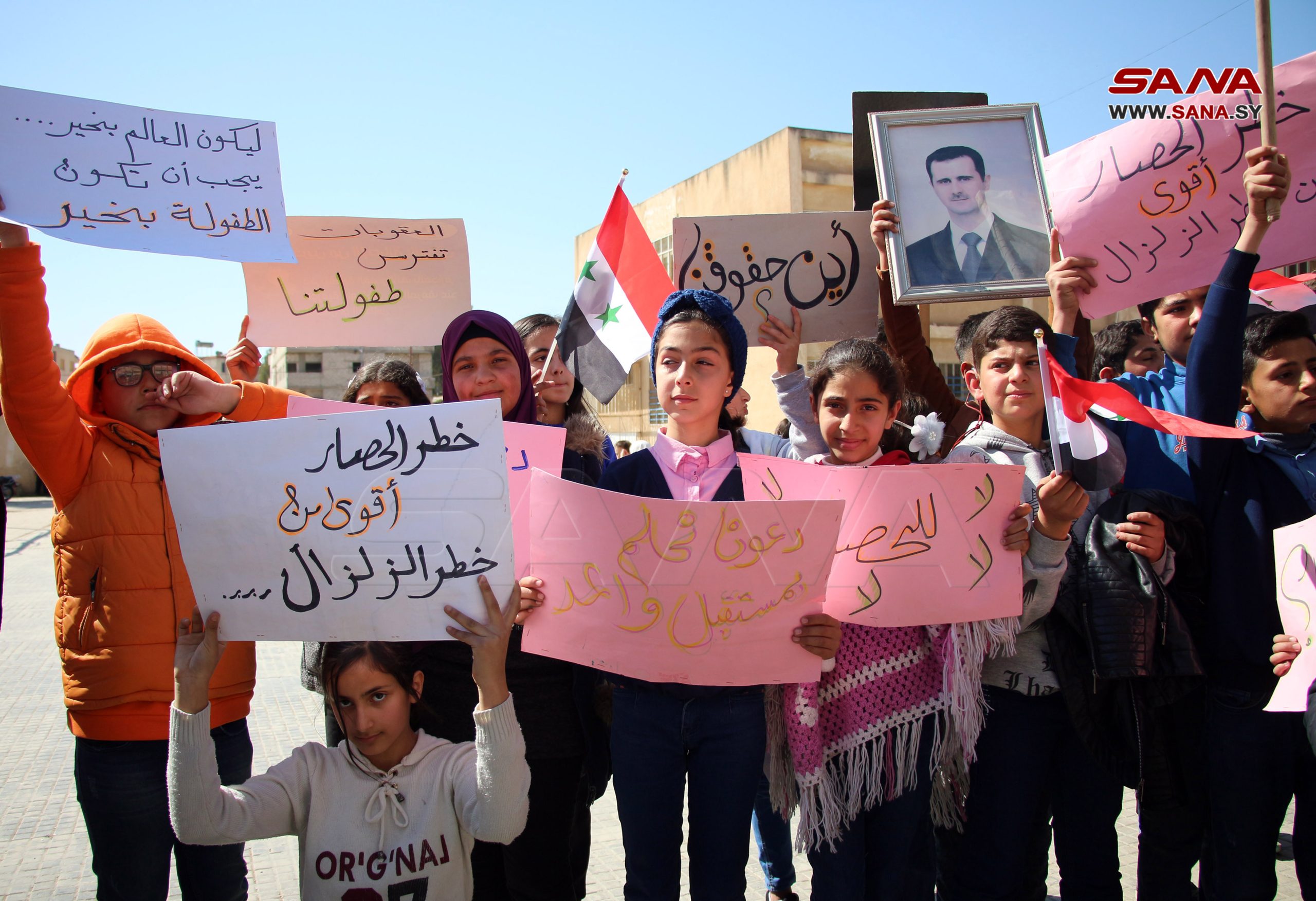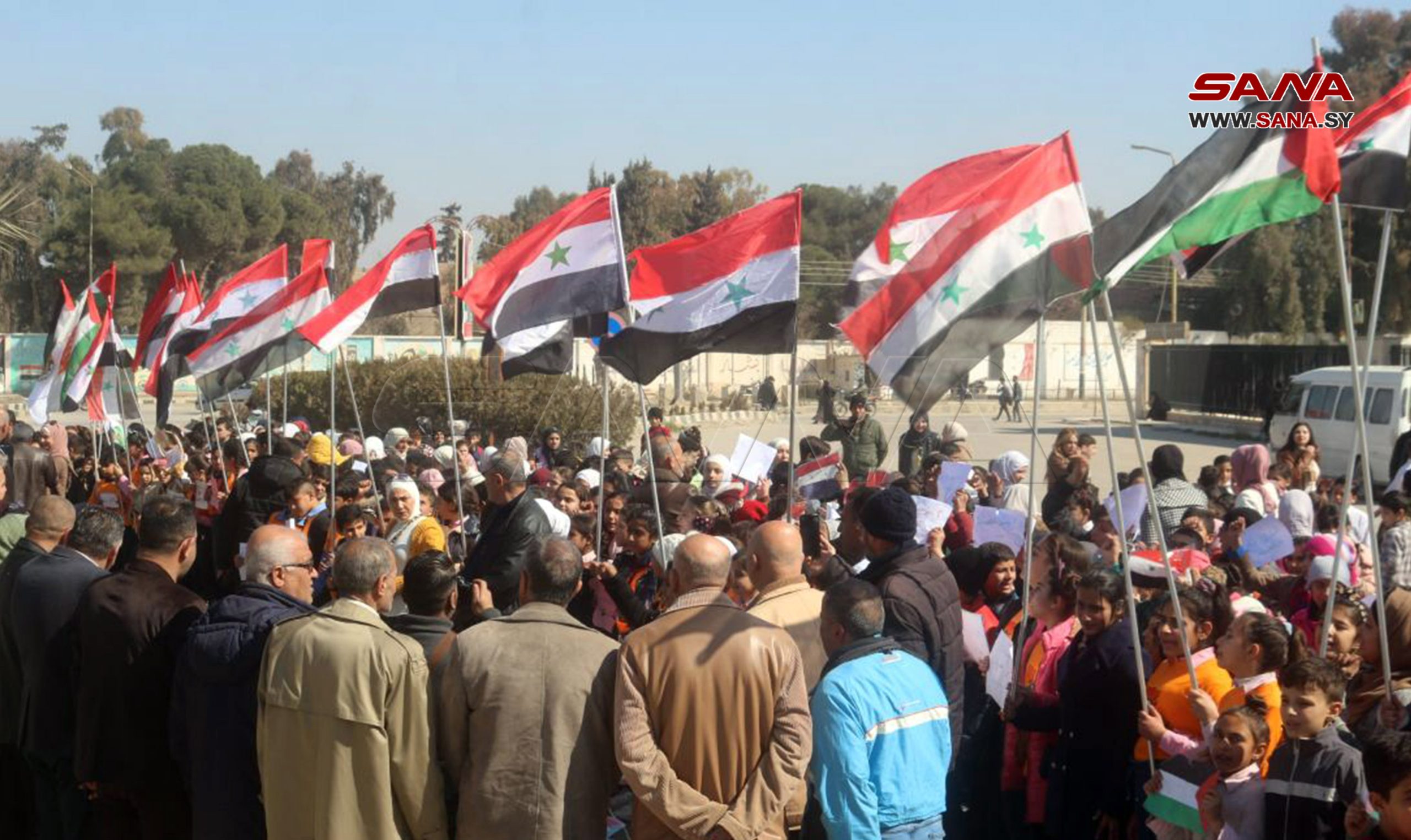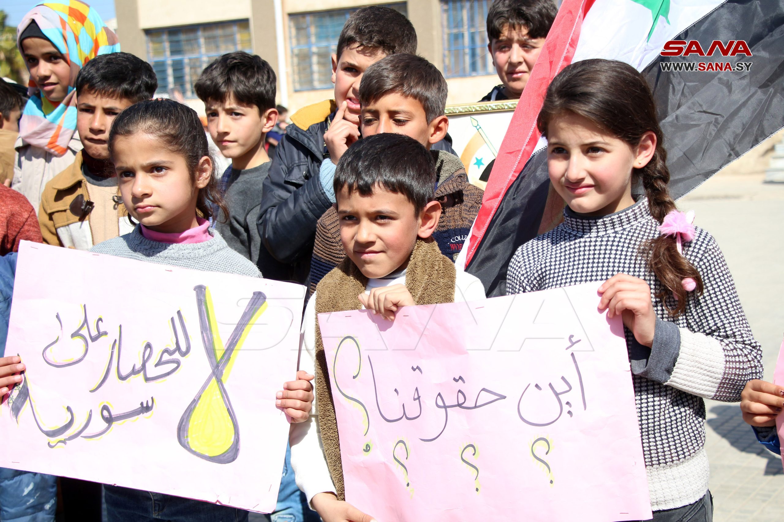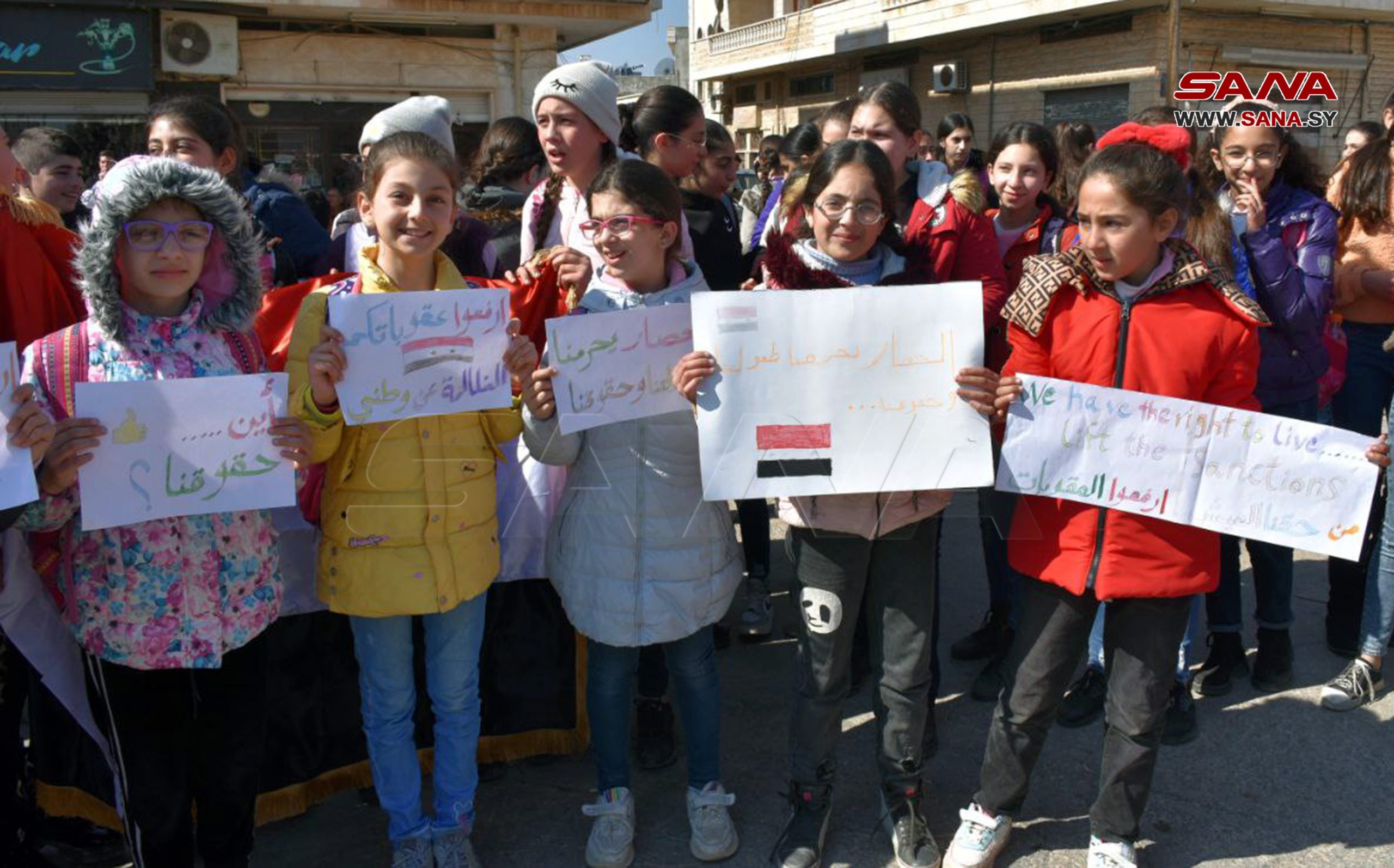 Provincias, 22 feb (SANA) Decenas de estudiantes sirios de la mayoría de las provincias sirias expresaron su rechazo a las medidas coercitivas unilaterales impuestas contra Siria por Estados Unidos y sus aliados.