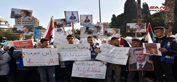 La manifestación fue convocada por la Alcaldía de Homs, donde los participantes portaron banderas nacionales y pancartas que exigen el levantamiento del asedio y las sanciones contra Siria.