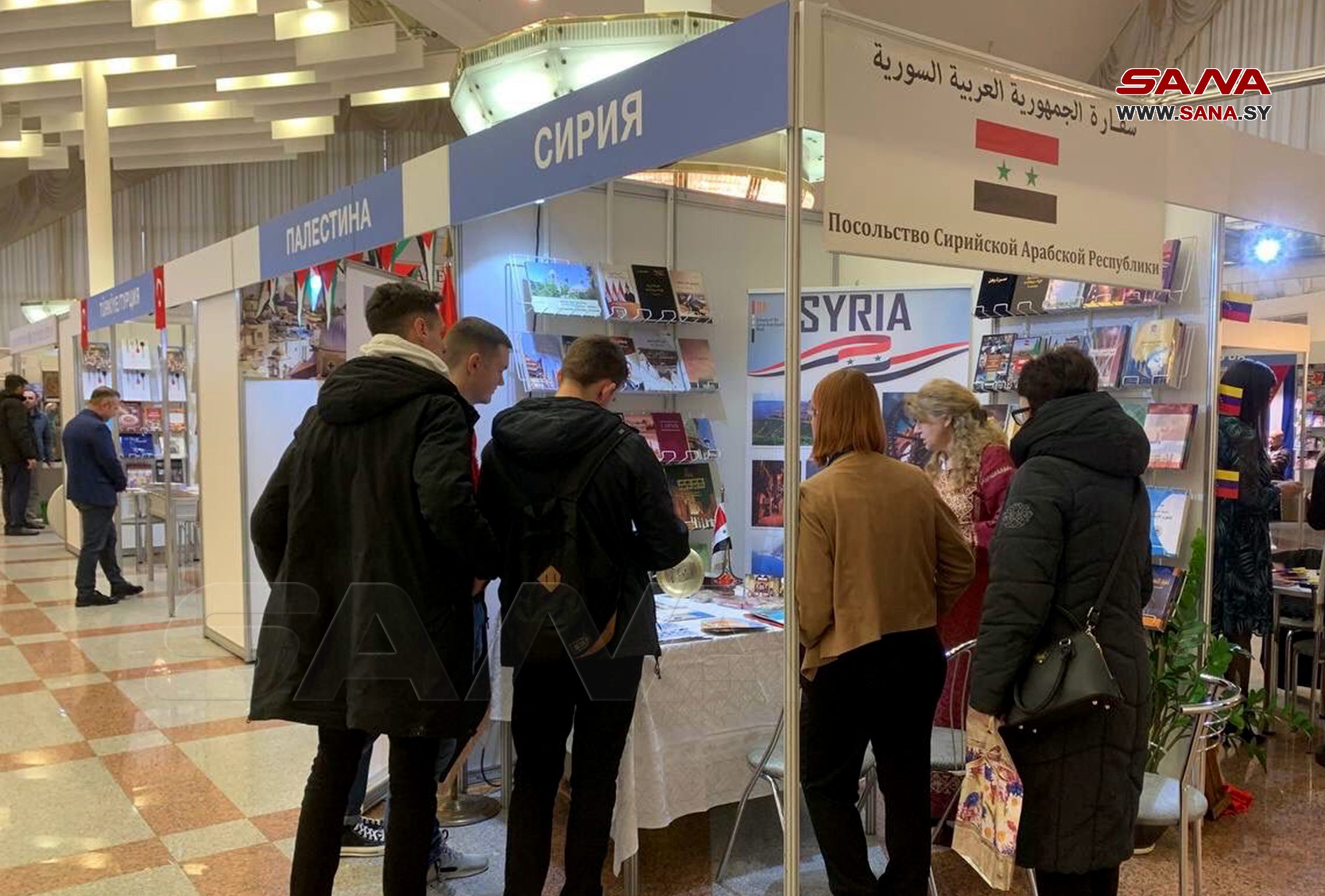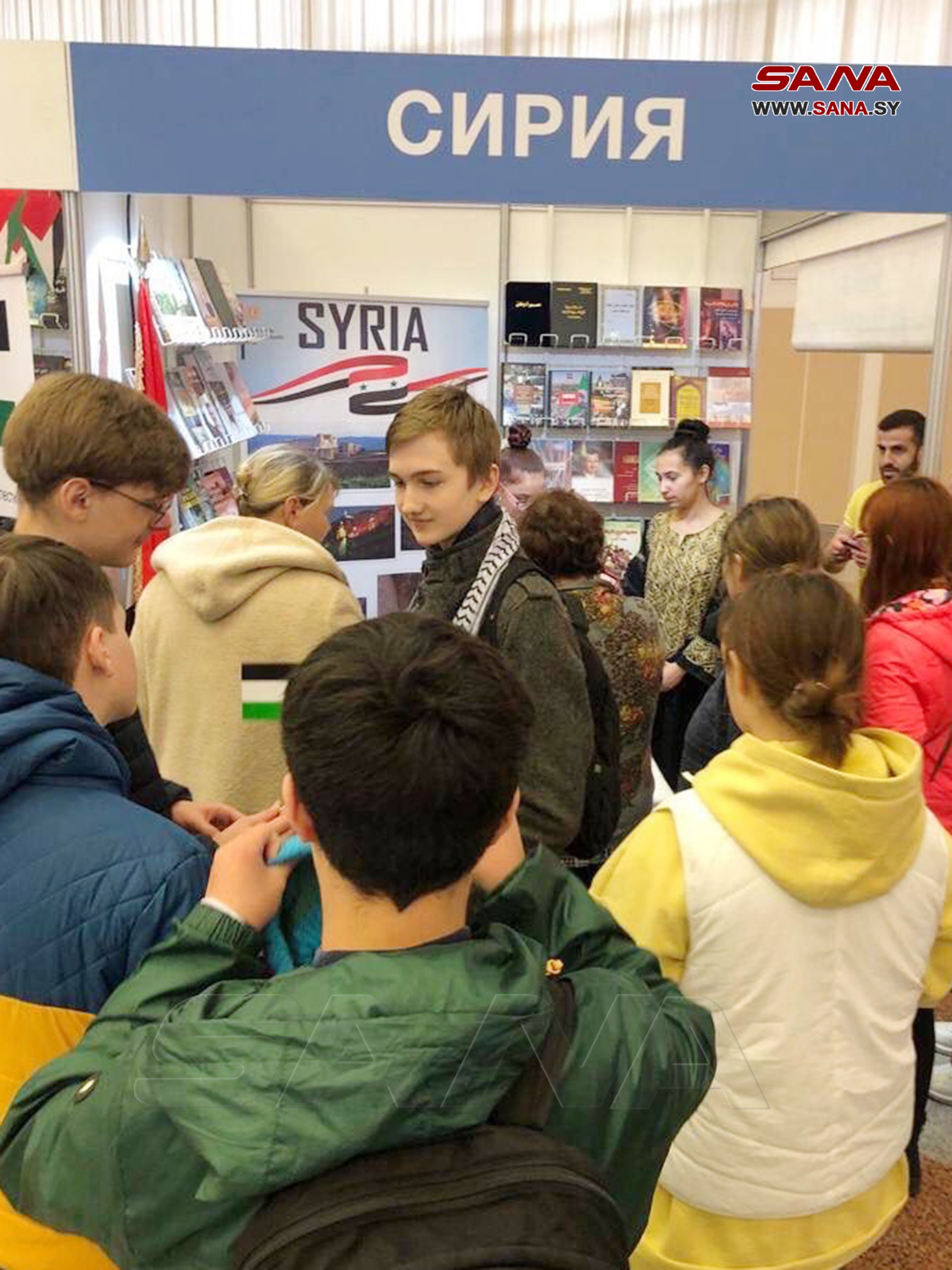 El pabellón sirio, representado por la Embajada de Siria en Minsk, incluyó una colección de libros en árabe y ruso, publicaciones, folletos y CD culturales y turísticos, además de fotografías, artesanías y vestimenta tradicional que expresan la historia y la civilización de Siria.