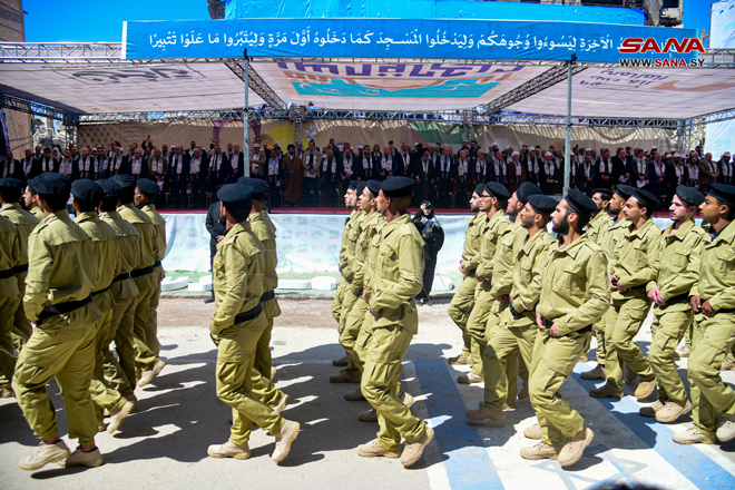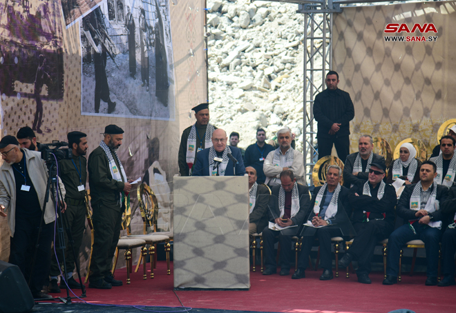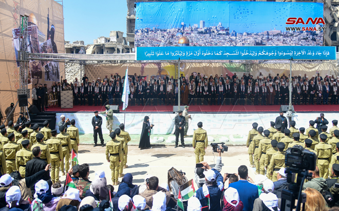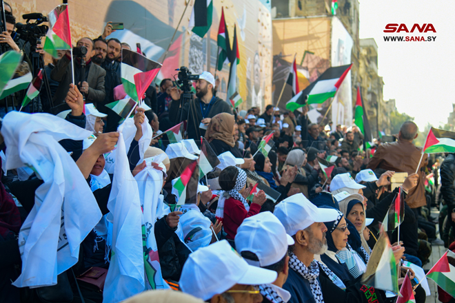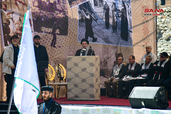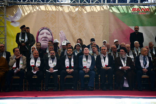 El acto se realizó como expresión de apoyo al pueblo palestino y su firmeza frente a las agresiones israelíes, e incluyó un desfile de los resientes de los campamentos palestinos en Siria.