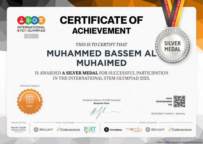 Los estudiantes Muhammad al-Mheimid y Hassan Dib ganaron respectivamente las medallas de plata y de bronce, mientras que Taim Watfa y Rammah Swaid recibieron los certificados de reconocimiento.