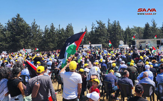 Jerusalén ocupada , 26 abr (SANA) Con motivo del 75 aniversario de la Nakba, miles de palestinos en los territorios ocupados en el año 1948 participaron hoy en la 26 edición de la Marcha del Retorno que tuvo lugar este año en del pueblo de Lajoun.