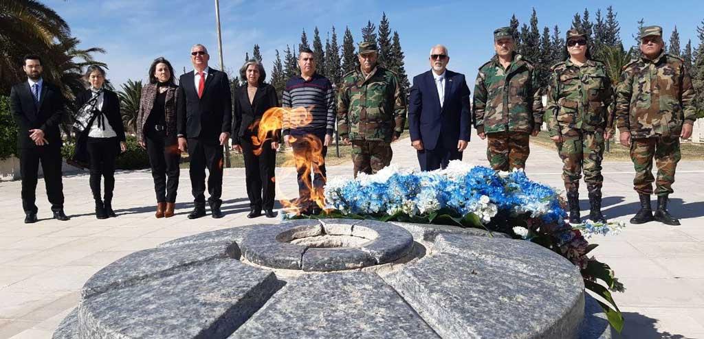 Sobre su tumba, cubanos y sirios colocaron una ofrenda floral en homenaje y reconocimiento a sus sacrificios.