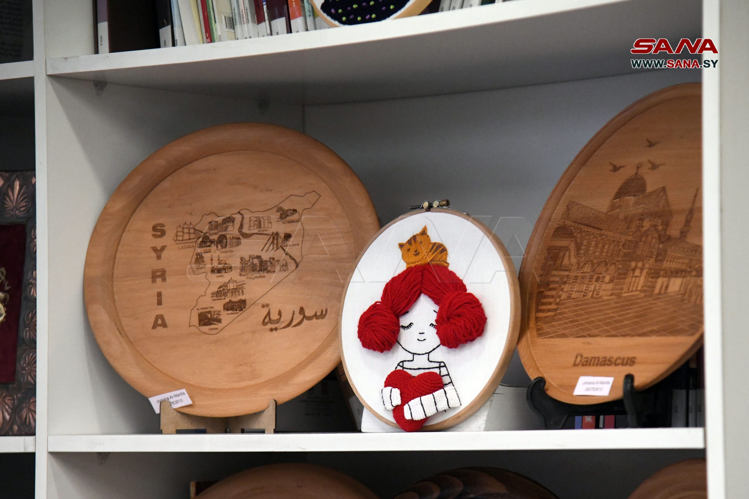 Las artistas sirias y palestinas presentaron piezas artesanales y artísticas que reflejan el patrimonio palestino, incluidos bordados, textiles tradicionales, figuras talladas en madera, pinturas en vidrio y telas recicladas.