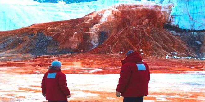 En 1911, el geólogo británico Thomas Griffith Taylor observó durante una expedición antártica que la base rocosa de un glaciar brotaba un líquido que parecía sangre, tornando el agua clara en un tono rojizo.