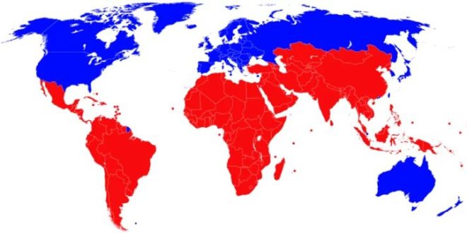 La mayoría de los mapas contemporáneos que muestran la división entre las naciones del Norte y Sur Global corren aproximadamente a lo largo del Trópico de Cáncer, con México y gran parte del Caribe, Sudamérica, la mayoría, si no es que toda África, Medio Oriente, Asia Central, Oriental y Suroriental (con excepción de Japón, Australia y Nueva Zelanda) como miembros del Sur Global. En ese sentido, dichos países representan más del 85% de la población mundial y cerca del 40% del PIB mundial.