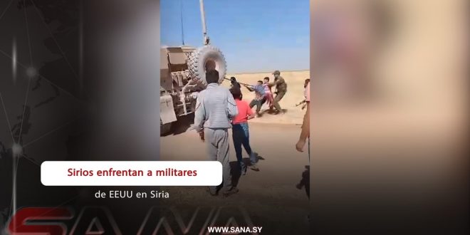 Pobladores expulsan convoy militar de EEUU y rompen sus banderas, en Siria