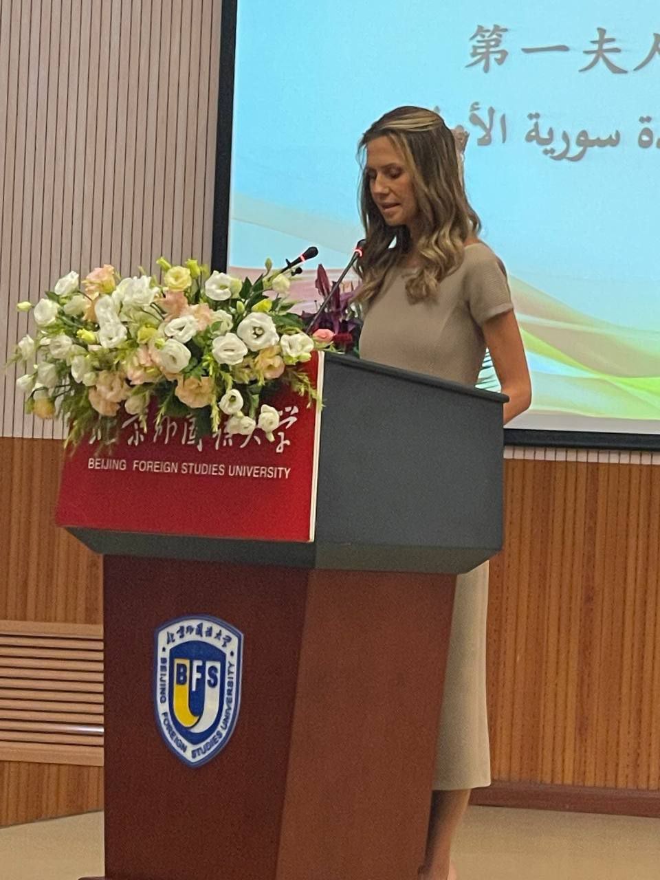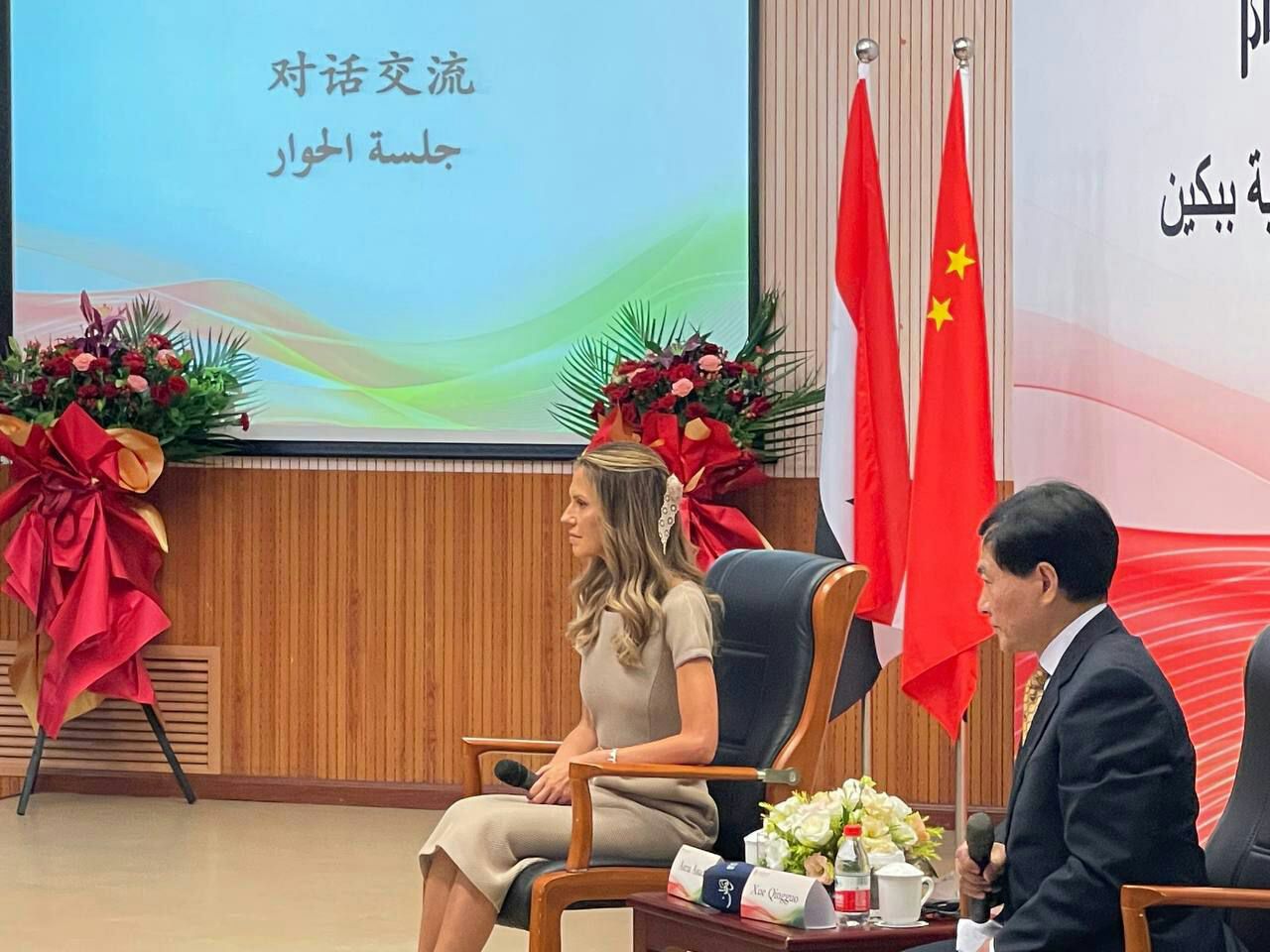 Beijing, 26 sep (SANA) La primera dama siria Asma al-Assad mantuvo hoy un encuentro de diálogo sobre la “lengua y las relaciones humanas y culturales entre países” con estudiantes de estudios árabes en la Universidad de Estudios Extranjeros de Beijing.