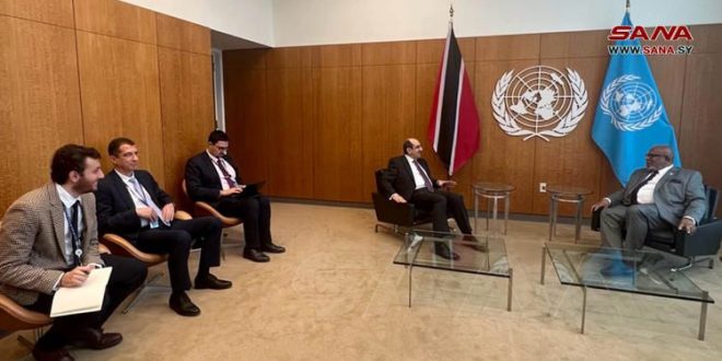 Nueva York, 26 sep (SANA) El vicecanciller designado y jefe de la delegación siria en el 78 período de sesiones de la Asamblea General de las Naciones Unidas, Bassam Sabbagh, se reunión con el presidente de la Asamblea, Dennis Francis, y lo felicitó por asumir la presidencia.