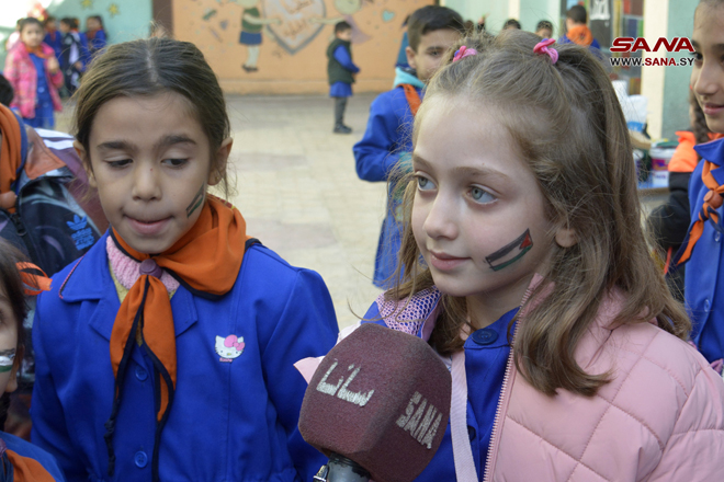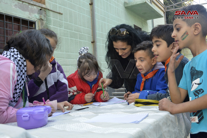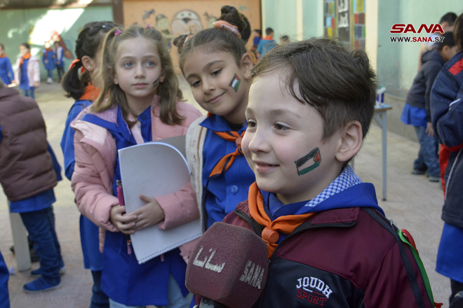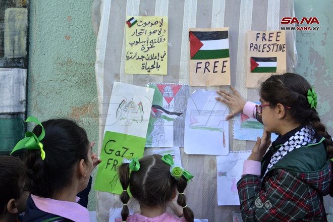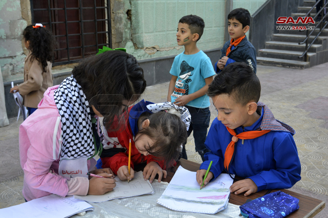 Homs, 18 oct (SANA) Un grupo de niños sirios expresó su solidaridad con los niños de Palestina y su pueblo a través de un taller organizado por la escuela Ikrimah Al-Makhzoumi, en la provincia siria de Homs.