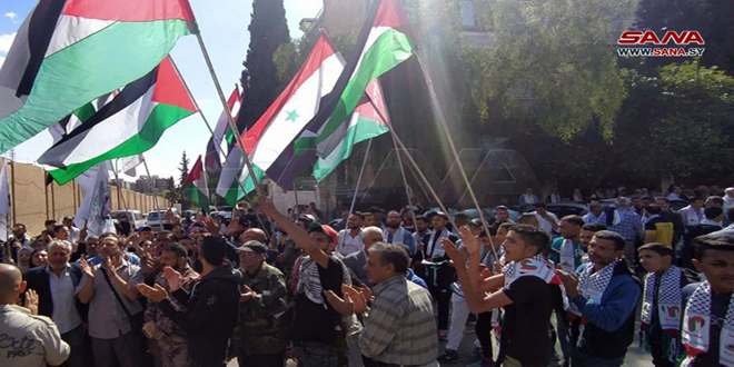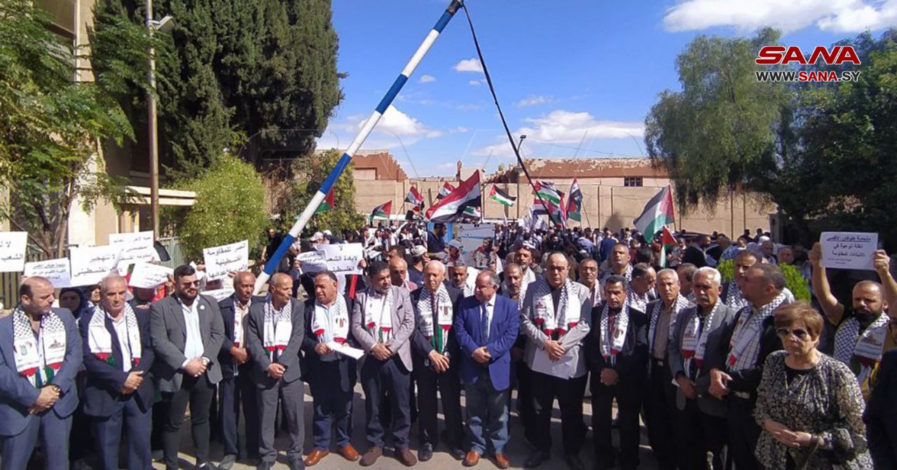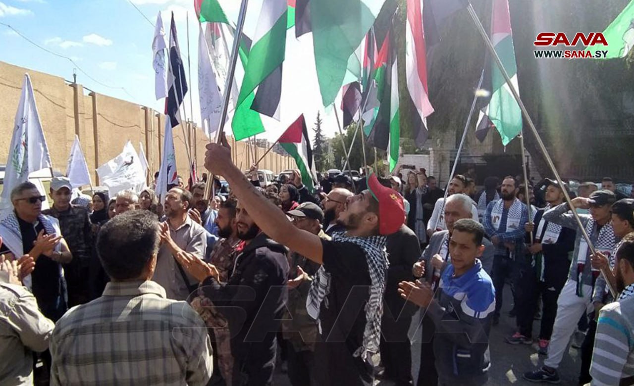 Damasco, 19 oct (SANA) Entidades sirias y fuerzas palestinas organizaron un acto de solidaridad con Paletsina frente a la sede de las Naciones Unidas en la capital Damasco.