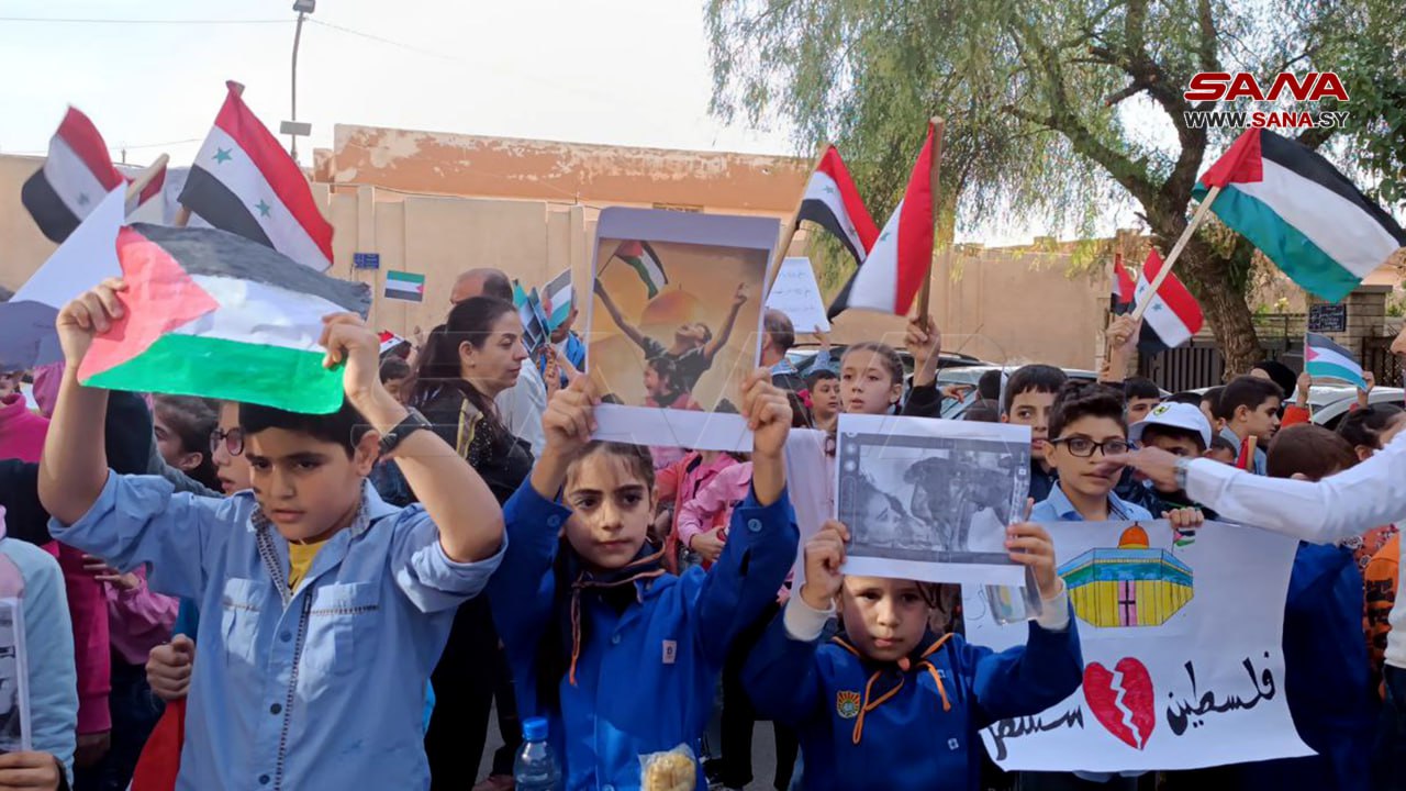 Provincias , 22 oct (SANA) Miles de profesores, estudiantes y miembros del personal docente en todas las escuelas de Siria organizaron actos de solidaridad para manifestar el apoyo a los palestinos que enfrentan una brutal agresión perpetrada por la ocupación israelí.