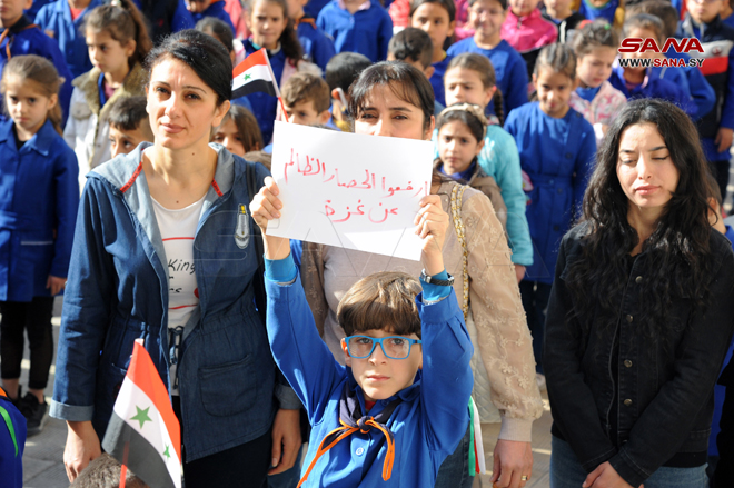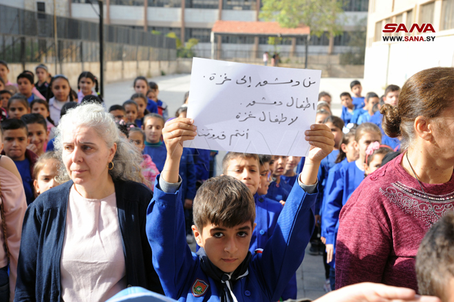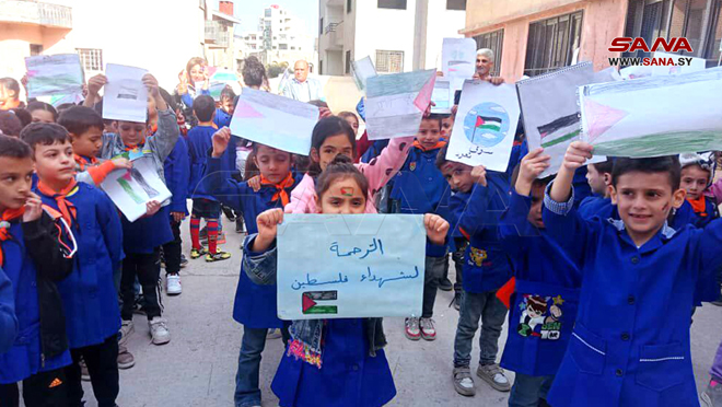 Las vanguardias de Damasco enviaron un mensaje a las Naciones Unidas a través del Dr. Khaled Al-Masry, asesor de medios de las Naciones Unidas en Siria, en el que resaltaron: “Nosotros, los niños de la República Árabe Siria, vinimos hoy para declarar nuestra solidaridad con nuestros hermanos en la querida Palestina ocupada, y para denunciar por todos los idiomas del mundo las brutalidades cometidas en su contra.”