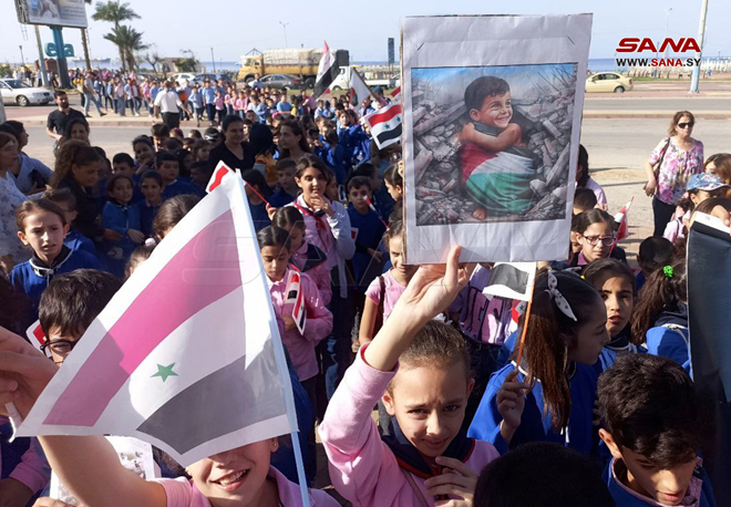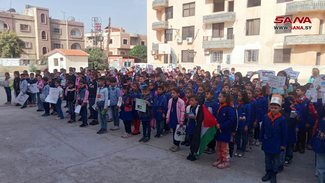 Provincias, 22 oct (SANA) Cuadros y niños de las Vanguardias del Partido “Al-Baath” realizaron hoy un acto de solidaridad con Palestina ocupada frente a la sede de las Naciones Unidas en Damasco, también en las escuelas y plazas principales de diferentes provincias sirias.