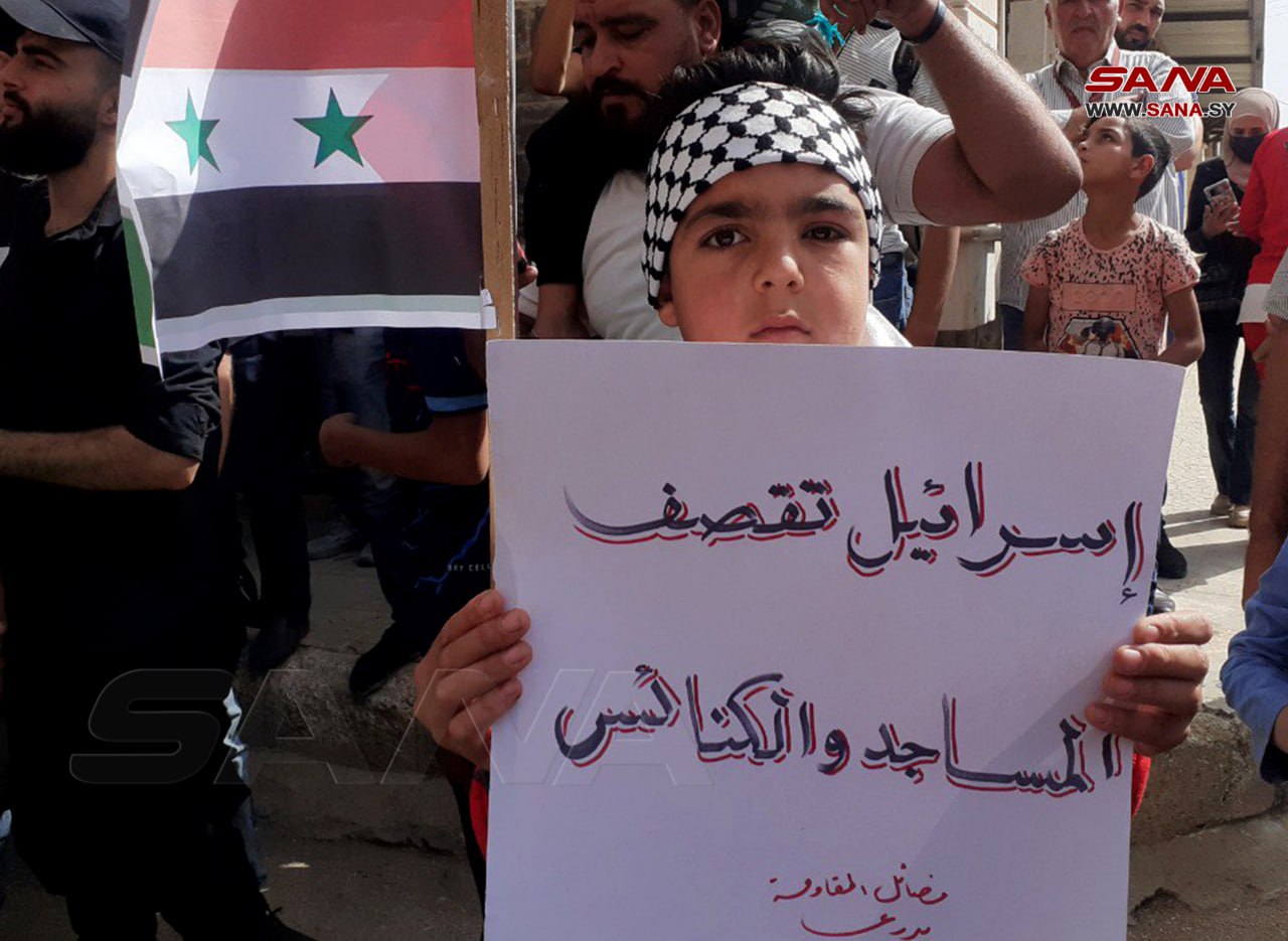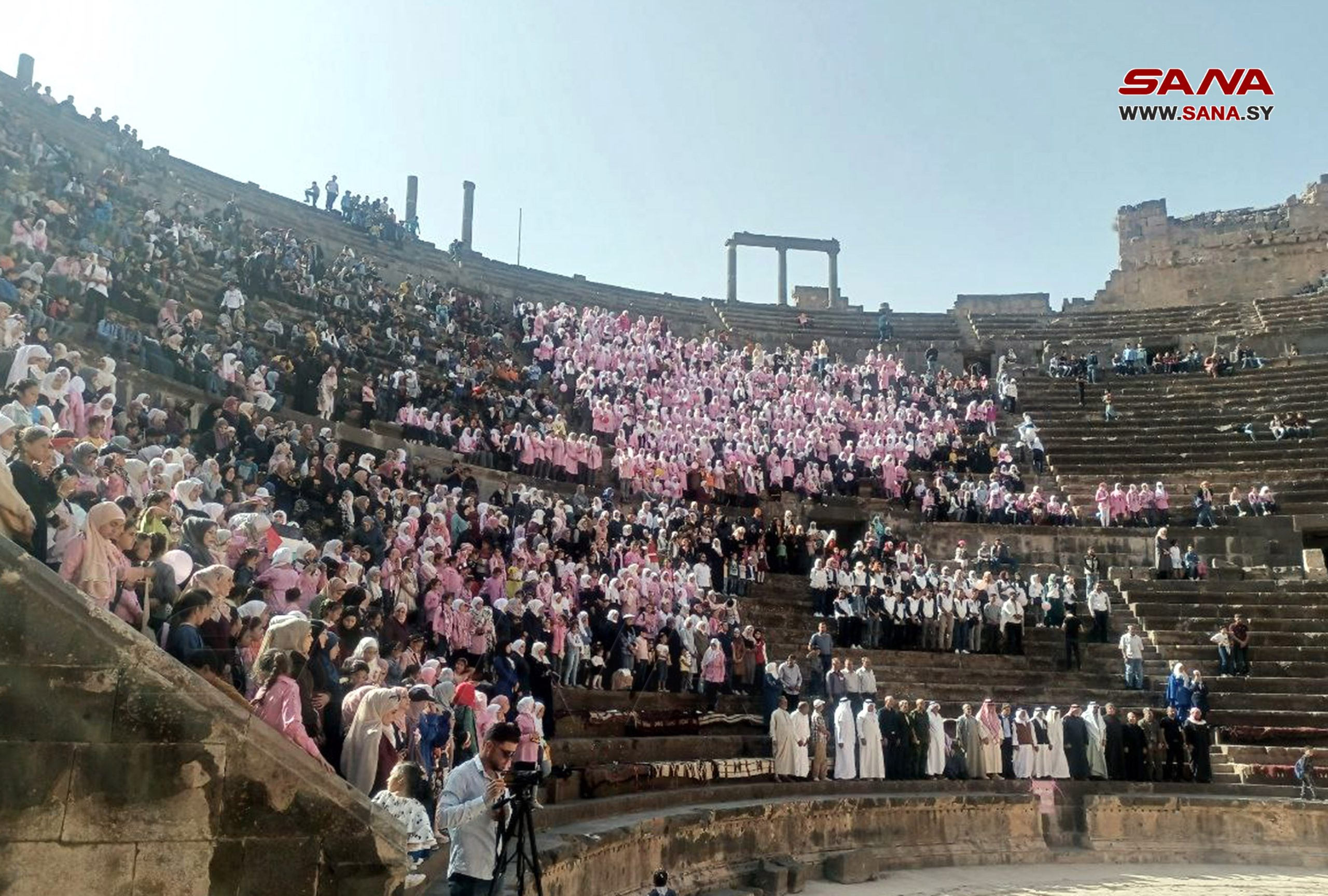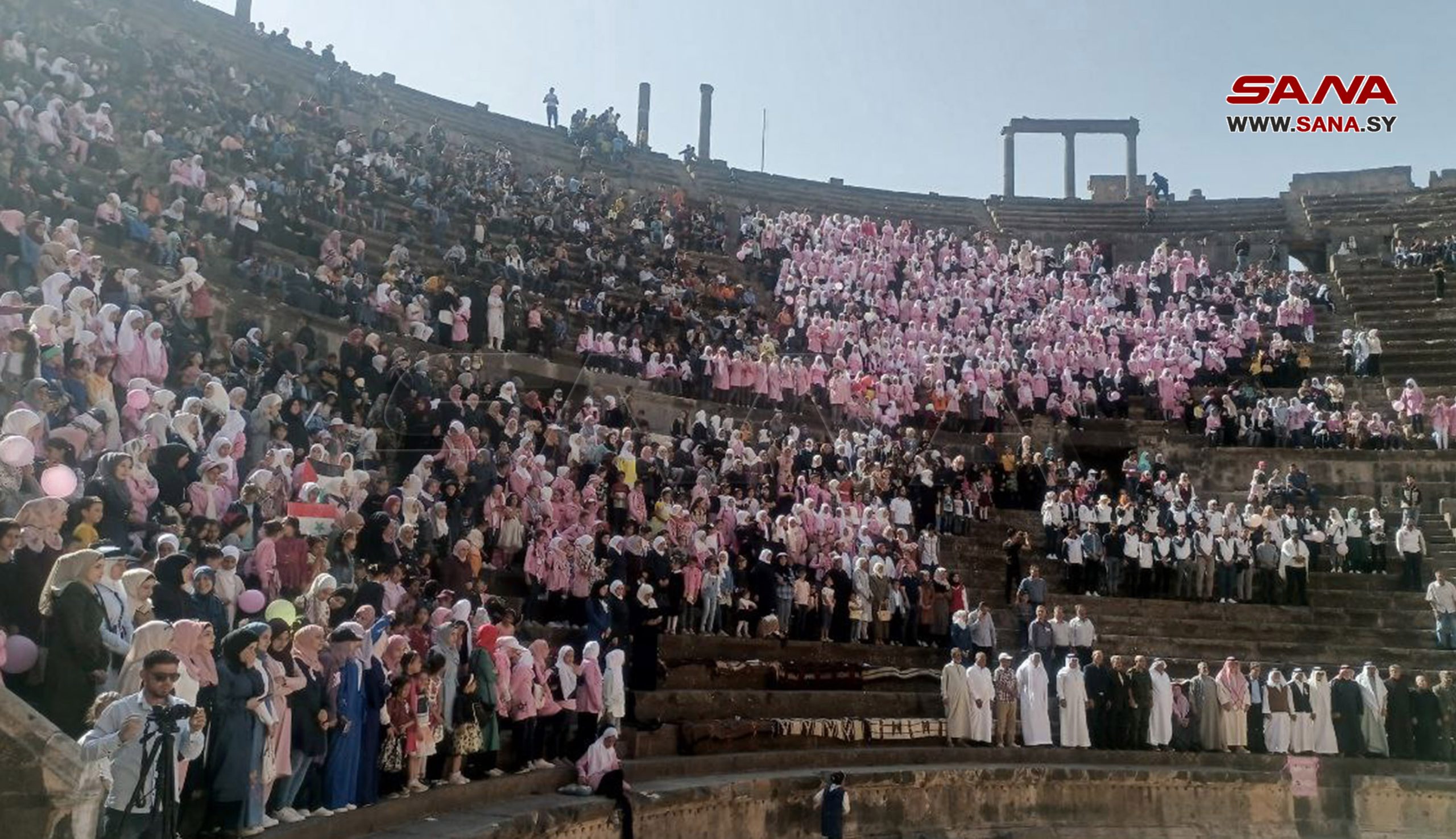 En el antiguo e histórico anfiteatro romano de Bousa en la provincia de Deraa en el sur de Siria, miles de jóvenes asistieron a un acto de apoyo al pueblo palestino en la Franja de Gaza y de denuncia a los crímenes del ocupante israelí.