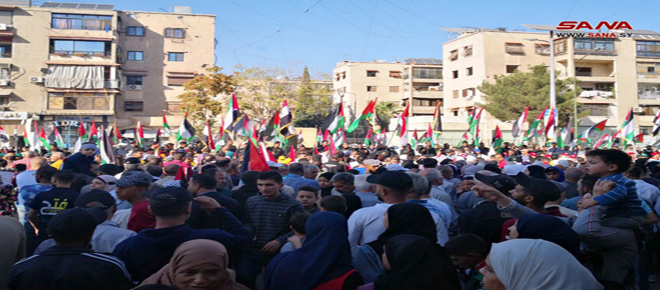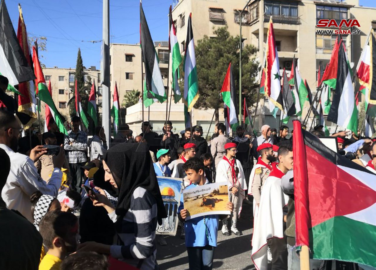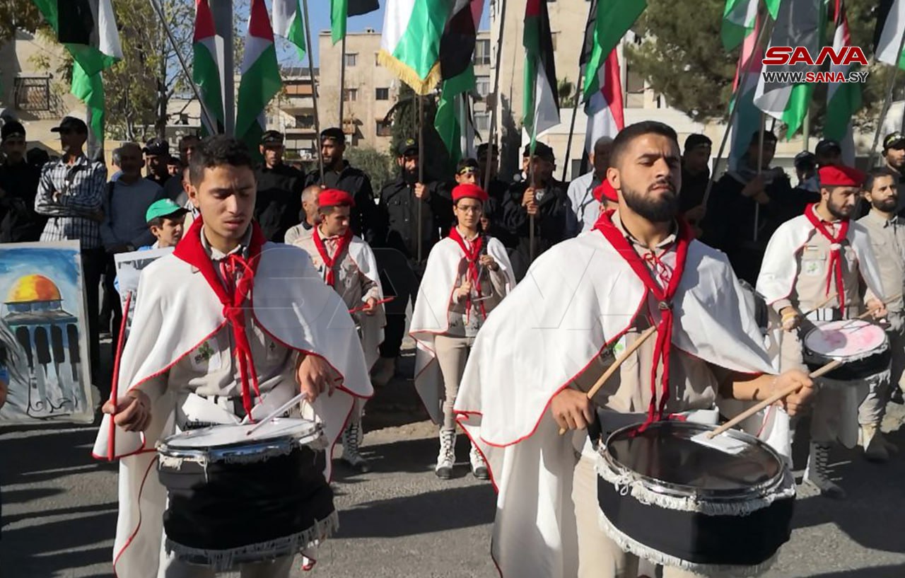 Damasco, 10 nov (SANA) Un masivo acto popular de solidaridad con Palestina tuvo lugar hoy en el campamento de refugiados palestinos Yarmouk al sur de Damasco, la capital siria.