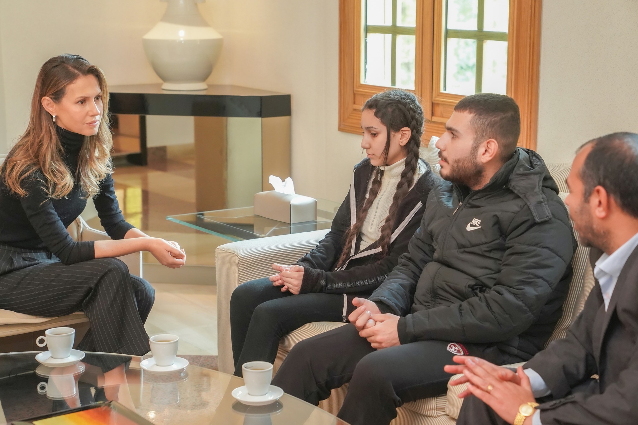Al recibir por separado a cada familia, la Primera Dama consideró que “durante la guerra en Siria, muchos perdieron sus hogares, sus trabajos o su fuente de sustento, y esto es difícil y cruel, pero la pérdida de las familias de los mártires fue más dura porque perdieron una parte de su alma, y a veces, perdieron toda su alma”.