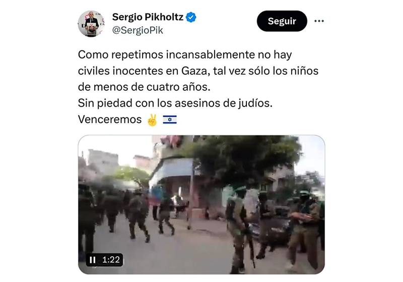 Ante el descrédito internacional que ha surgido como una natural y sana consecuencia ante esta impune acción criminal en curso expuesta a los ojos del mundo, mediante el repudio de multitudinarias manifestaciones sociales en las principales ciudades de todo el globo, defender o pretender validar la acción del victimario y buscar convertirlo en víctima ante la opinión pública con palabras como las vertidas por el Sr. Pikholtz, no solo va en contra de todo principio de humanismo y solidaridad, sino que representa un criminal mensaje de irrestricto apoyo al genocidio, la limpieza étnica, y más específicamente a la matanza de niños.