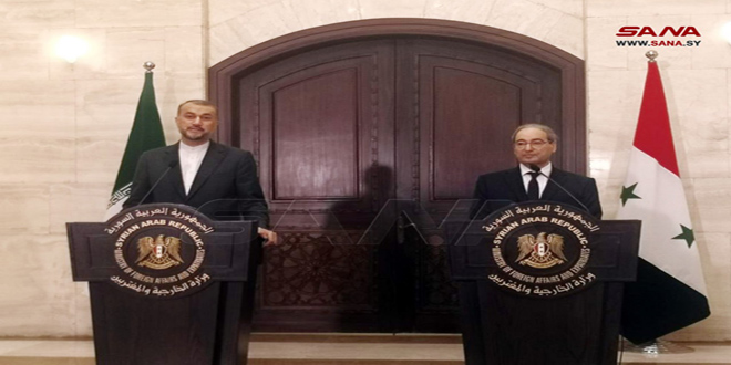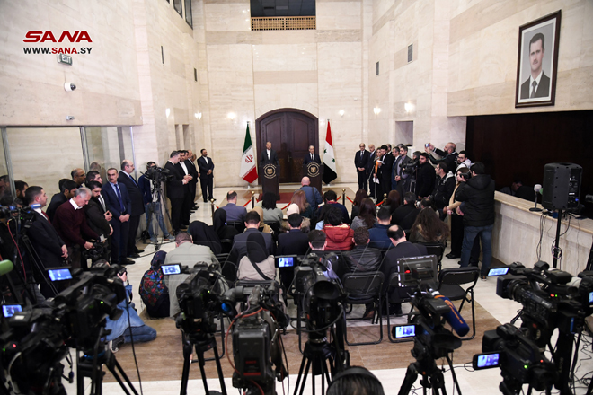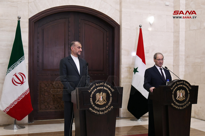 Damasco, 11 feb (SANA) El ministro de Asuntos Exteriores y Expatriados de Siria Faisal Mekdad, y su homólogo iraní, Hossein Amir Abdullahian, sostuvieron hoy una rueda de prensa en la sede de la Cancillería siria.