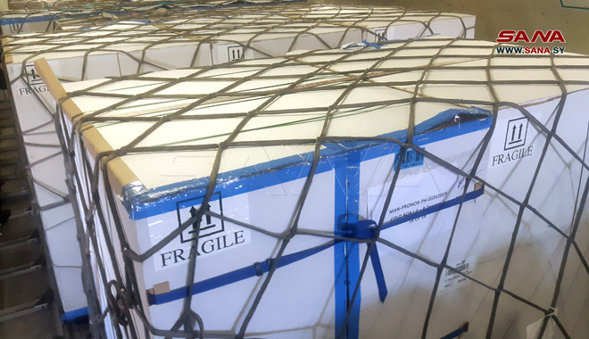 Una delegación encabezada por el secretario general de la Media Luna Roja Emiratí, Rashid Mubarak Al-Mansouri, entregó la carga del avión al Ministerio de Salud de Siria.