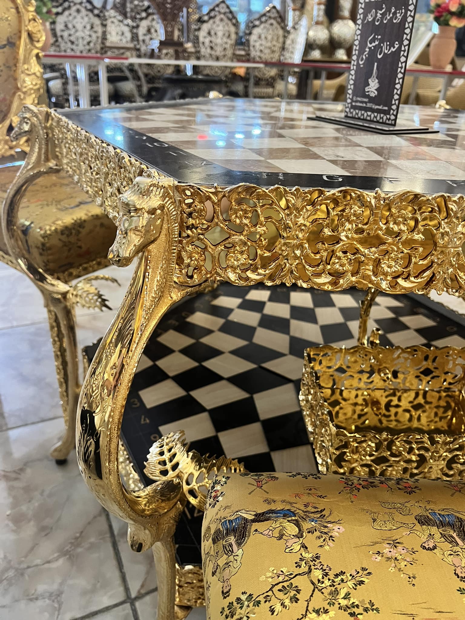 Explicó que el diseño de una mesa hexagonal de dos niveles sostenido por columnas de cobre diseñadas con la forma de un caballo árabe. Mientras el mármol local y el brocado damasquino en sus siete colores estuvieron entre los materiales a los que recurrió Tanbakji en este diseño.