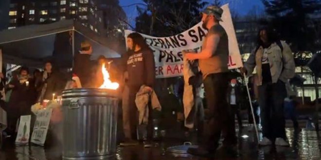 Washington, 29 feb (SANA) Ex soldados estadounidenses quemaron sus uniformes militares en solidaridad con el soldado Aaron Bushnell, quien se quemó frente a la embajada de “Israel” en Washington en protesta por las masacres genocidas cometidas por el ocupante israelí contra el pueblo palestino.