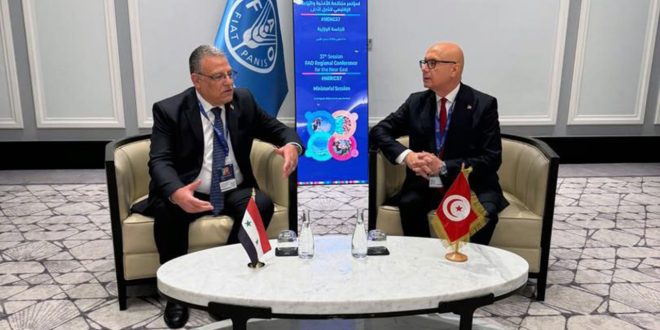 Amán, 5 mar (SANA) El ministro de Agricultura y Reforma Agraria de Siria, Mohamed Hassan Qatna, se reunió hoy con su homólogo tunecino, Abdel Moneim Belaati, y con el director general de la FAO, Qu Dongyu, en el marco de la 37ª Conferencia Regional de la FAO sobre Alimentación y Agricultura para el Cercano Oriente y el Norte de África, que se celebra en Amán, la capital de Jordania.