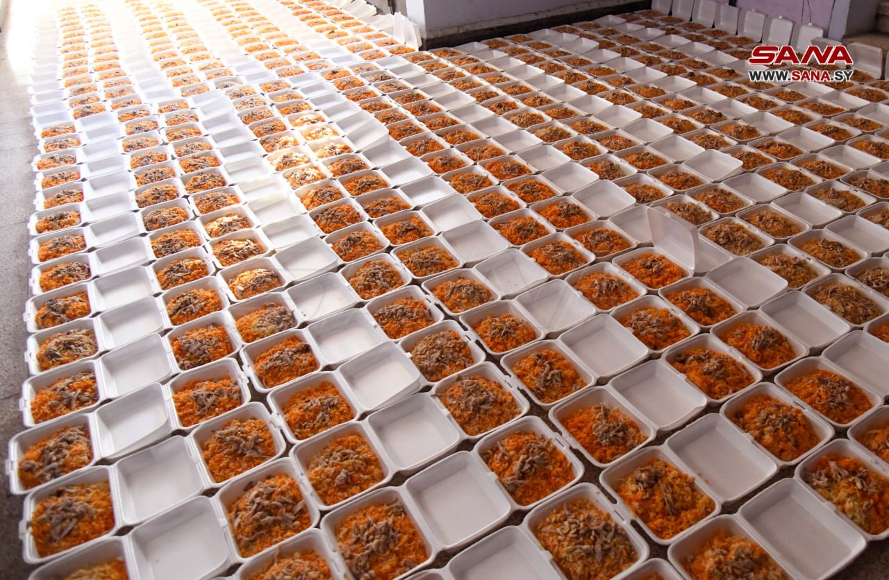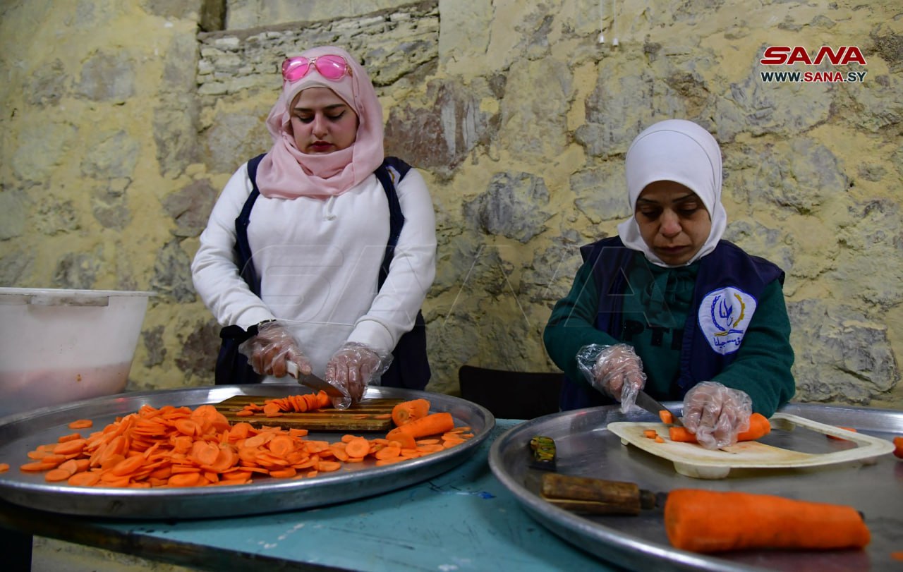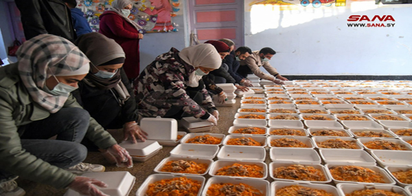 En la ciudad de Jairud en la gobernación Damasco-campo, las familias pobres y las de los mártires y heridos se beneficiaron de una iniciativa protagonizada por 16 jóvenes voluntarios, que elaboran comida en una cocina de campaña.
