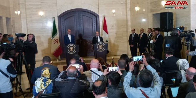 Damasco, 8 abr (SANA) Los ministros de Asuntos Exteriores de Siria, Faisal Al-Mekdad, y de Irán, Hossein Amir Abdollahian, sostuvieron hoy una rueda de prensa en la sede de la Cancillería siria en esta capital.